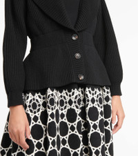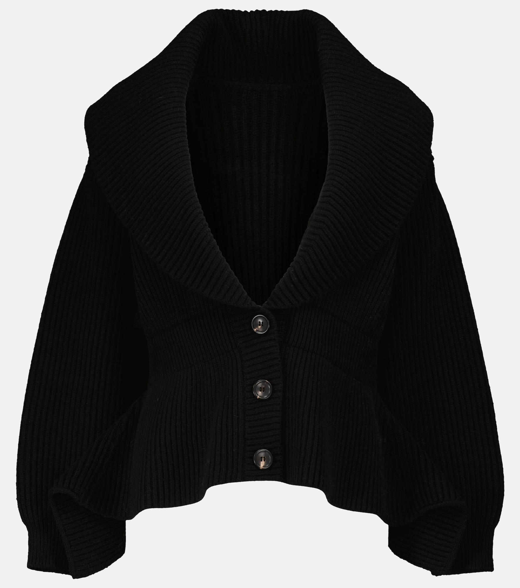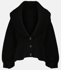 Knitwear from Alaïa is an ever-elegant addition to your collection, exhibited by this black cardigan. Ribbed-knit from cozy wool and cashmere, it has magnified shawl lapels and a signature peplum hem. Product Details - Made in Italy - Material: 92% wool, 8% cashmere - Closure: buttoned front - Designer color name: Noir - Care instructions: dry clean - Item number: P00573045 Size & Fit - True to size - Dropped shoulders - Cinched waist - Mid-weight material - Falls to the hip - The model seen in the picture is 178cm-5'10" and wearing a size FR 36
