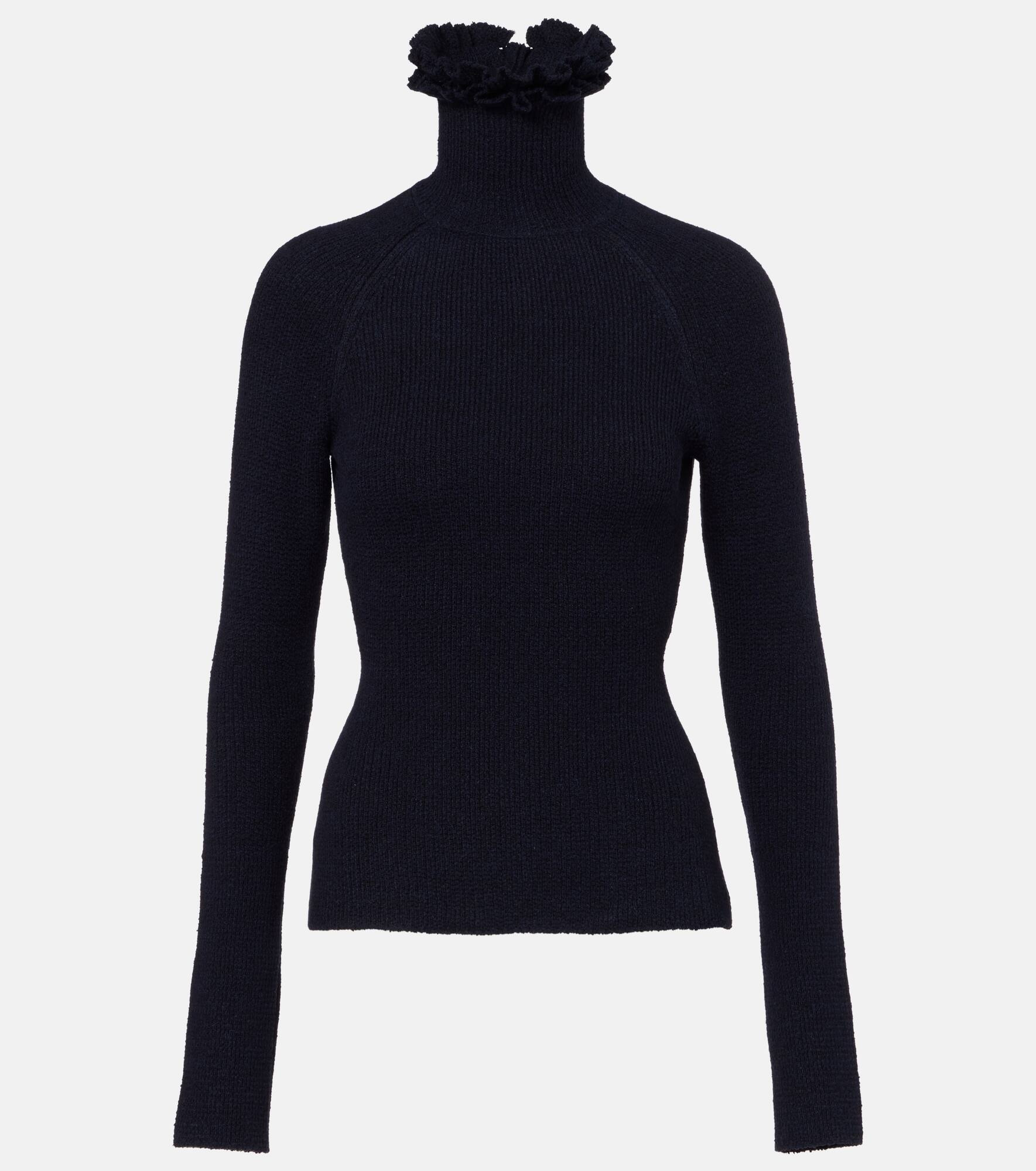 Honoring Azzedine Alaia’s legacy, the maison’s sculptural yet wearable collections hold an artful balance that only the most skilled designers can achieve. Made from a soft wool and silk-blend material, this sweater features a warm, ruffled turtleneck and ribbed-knit construction. Product Details - Material: 48% wool, 43% silk, 9% polyamide - Care instructions: specialist clean - Made in Italy - Designer color name: Marine - Item color: blue - Material II: 45% wool, 42% silk, 13% polyamide - Collar: turtleneck - Item number: P01085054 Size & Fit - True to size - Fitted - Stretchy fabric - Falls to the hip - The model seen in the picture is 178cm-5'10" and wearing a size FR 34