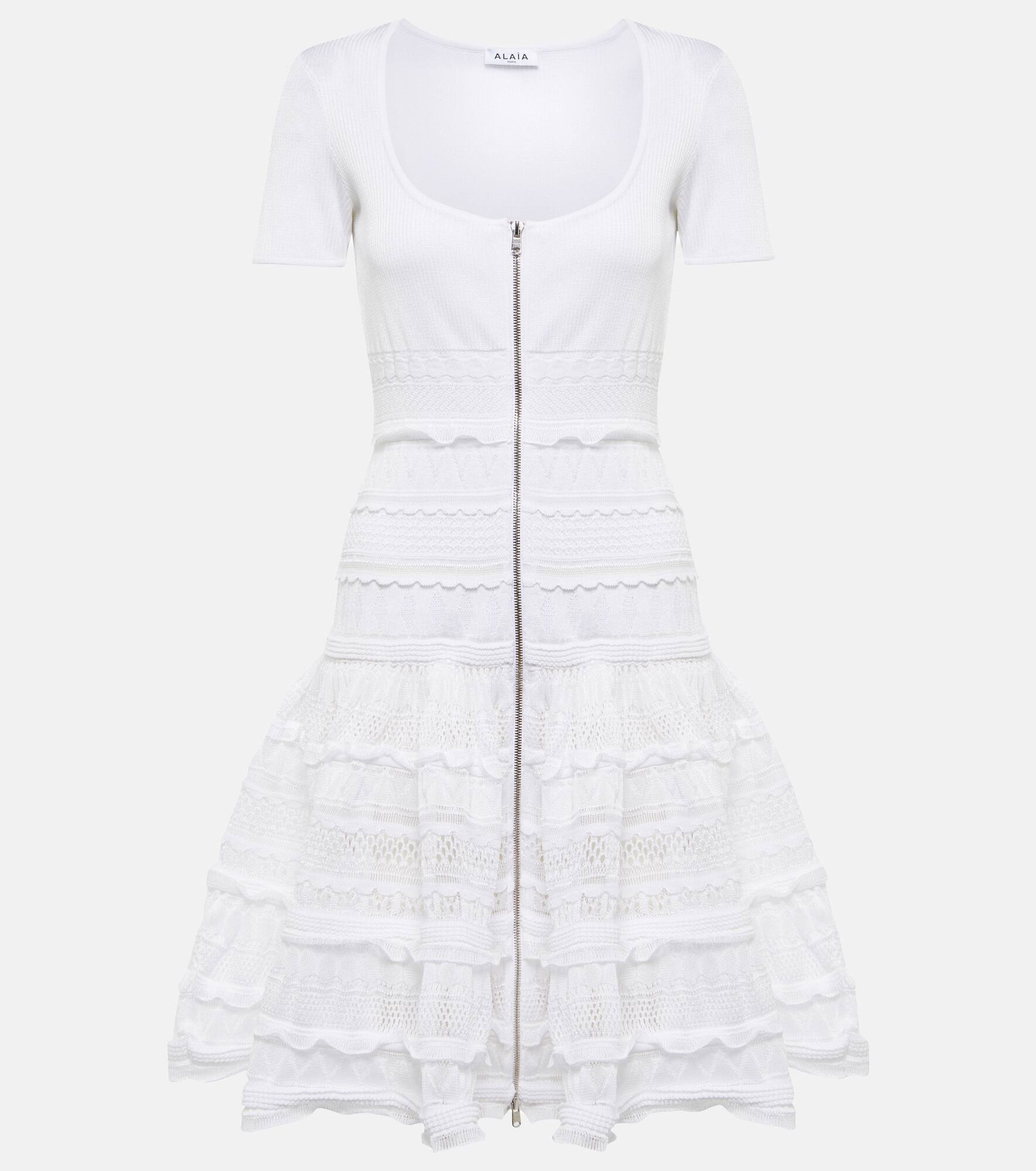 Invest in one of Alaïa's brand-signature silhouettes with this zipped-front minidress. Finely knitted to a fit and flare design, this piece features ruffles and open-work detailing throughout. - material: 83% viscose, 13% polyester, 3% polyamide, 1% elastane - material II: 78% viscose, 15% polyester, 5% polyamide, 2% elastane - material III: 84% viscose, 11% polyester, 4% polyamide, 1% elastane - care instructions: dry clean - zipped front - Made in Italy - Designer colour name: Blanc Optique - Runs small, please see Size & Fit tab