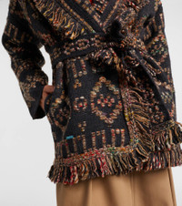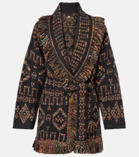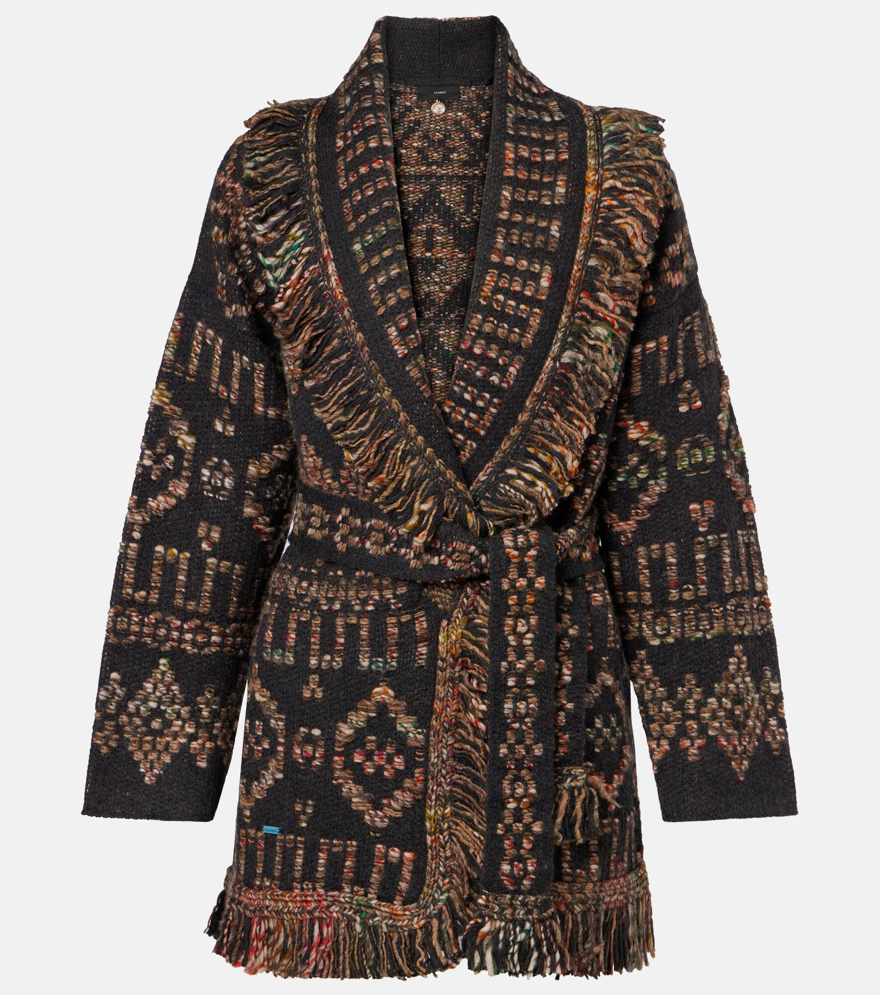 The Grunge Beat cardigan from Alanui is crafted from a wool-blend and features geometric motifs. Inspired by the Pacific Northwest, this stylish piece includes frayed edges, slit pockets, and a removable belt. Product Details - Material: 72% wool, 28% acrylic - Care instructions: hand wash - Made in Italy - Designer color name: Charcoal/Multicolor - Item color: multicolor - Pockets: side slit pockets - Self-tie belt - Includes: garment bag - Item number: P01058843 Size & Fit - True to size - Dropped shoulders - Loose fit, comes with belt - Slightly stretchy fabric - Falls below the hip - The model seen in the picture is 178cm-5'10" and wearing a size S