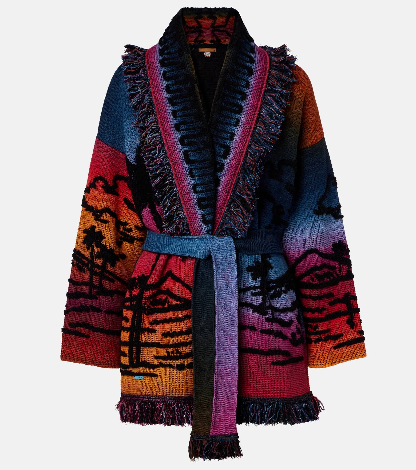 The Sunset Stories cardigan from Alanui is crafted from a soft blend of cashmere, cotton, and wool. This vibrant design showcases a jacquard landscape motif, complete with shawl lapels and fringed detailing along the edges. Product Details - Material: 66% cashmere, 30% cotton, 4% wool - Care instructions: dry clean - Made in Italy - Color: multicoloured - Designer color name: Multicolor Black - Detachable belt - Pockets: side slit pockets - Closure: open front - Item number: P01114306 Size & Fit - True to size - Dropped shoulders - Loose fit, comes with belt - Slightly stretchy fabric - Falls below the hip - The model seen in the picture is 178cm-5'10" and wearing a size XS