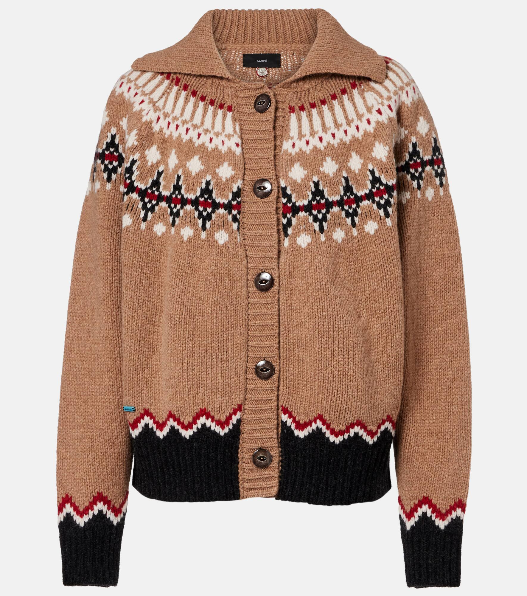 The Sweet cardigan from Alanui is crafted in a soft virgin-wool jacquard knit and finished with ribbed trims. Inspired by classic Nordic styles, this warm staple features a cozy Fair Isle motif. Product Details - Material: 100% virgin wool - Care instructions: dry clean - Made in Italy - Designer color name: Camel/Multicolor - Item color: brown, gray - Closure: buttoned front - Cuff: ribbed - Hem: ribbed - Item number: P01058868 Size & Fit - True to size - For a closer fit, we recommend taking one size down - Designed for a loose fit - Slightly stretchy fabric - Falls to the hip - The model seen in the picture is 178cm-5'10" and wearing a size XS