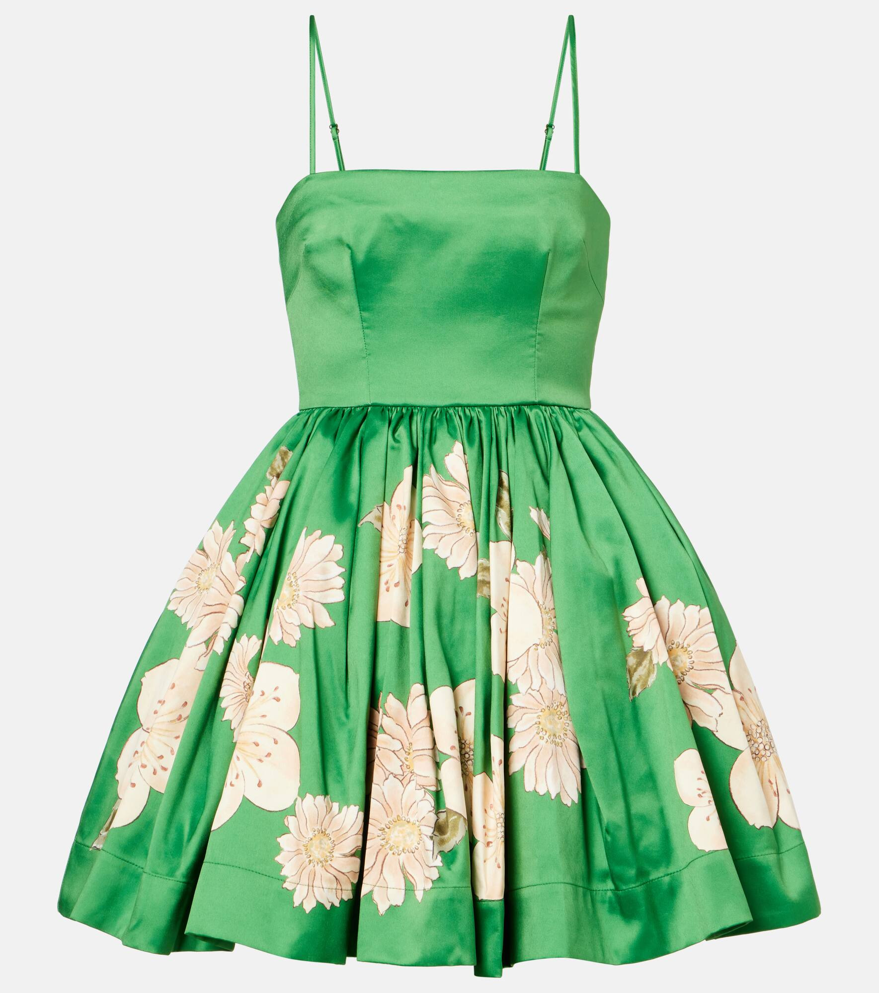 A contemporary brand with an artisanal focus, Alemais celebrates the art of fashion through an eclectic mix of patterns and prints. This minidress features a cinched waist, a gathered skirt, and a delicate floral print. Product Details - Material: 47% polyester, 46% cotton, 7% nylon - Care instructions: dry clean - Made in China - Designer color name: Green - Item color: green, multicolor - Lining: 100% cotton - Lining II: 100% polyester - Closure: zipped back - Adjustable shoulder straps - Pockets: side slit pockets - Fully lined - Item number: P01063715 Size & Fit - True to size - Cinched waist - Non-stretchy fabric - The model seen in the picture is 178cm-5'10" and wearing a size UK 8
