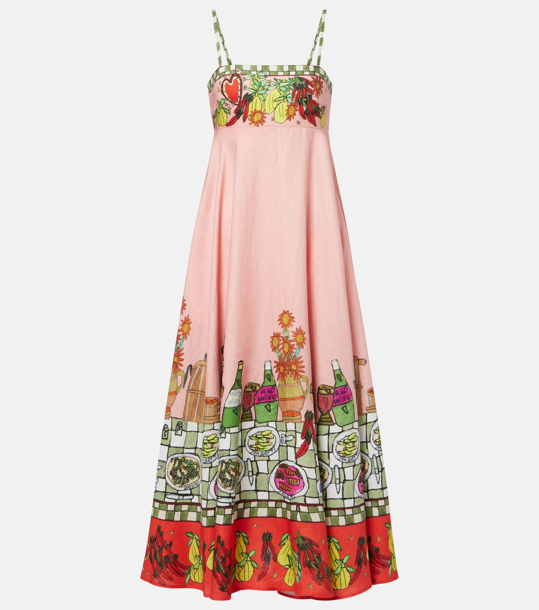 A contemporary brand with an artisanal focus, Alemais collaborates with graphic novelist Greg Sindel for an eclectic mix of prints. The Contessa linen maxi dress is tailored to a sleek silhouette and finished with thin shoulder straps. Product Details - Material: 100% linen - Care instructions: hand wash - Made in China - Designer color name: Multi - Item color: pink, multicolor - Pocket lining: 100% cotton - Closure: zipped side - Adjustable shoulder straps - Pockets: side slit pockets - Item number: P01096078 Size & Fit - True to size - Elasticated top - Cinched waist - Non-stretchy fabric - The model seen in the picture is 178cm-5'10" and wearing a size UK 6