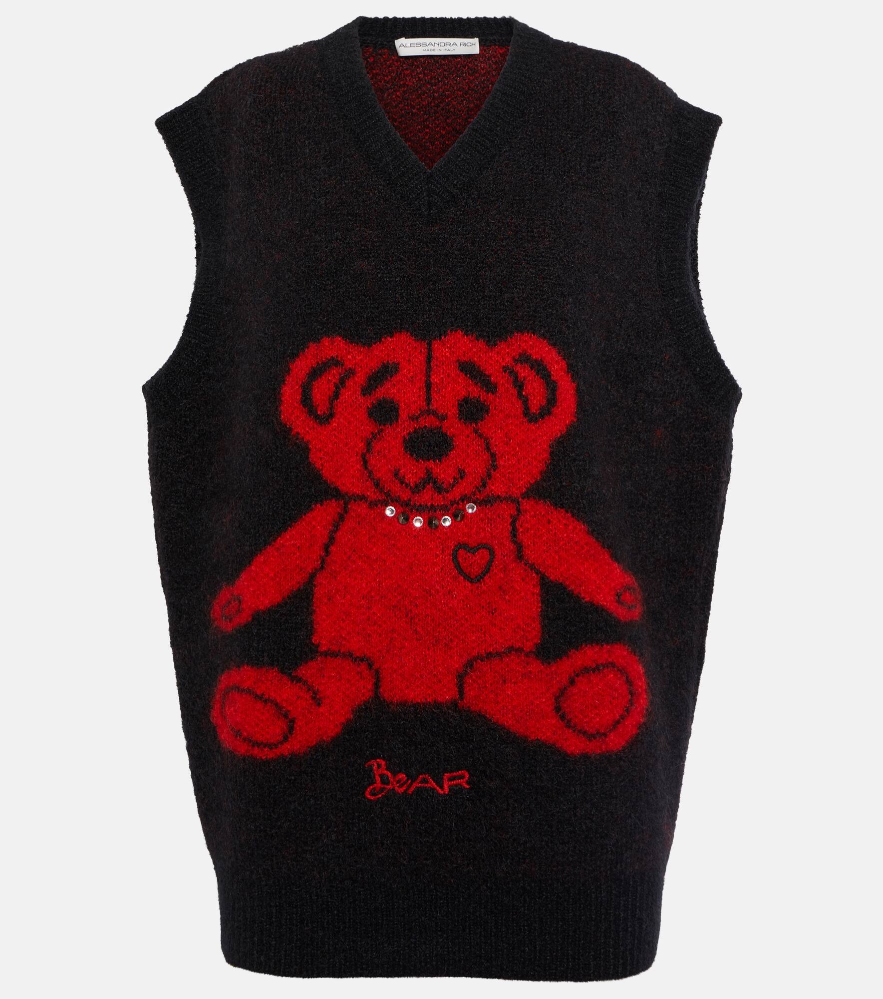 Alessandra Rich offers a graphic update to your edit with the studded bear motif on this knitted vest. Made of a tactile mohair blend, this sleeveless V-neck style has a boxy, oversized fit. Product Details - Material: 82% mohair, 2% elastane, 16% polyamide - Care instructions: specialist clean - Made in Italy - Designer color name: Black - Item number: P00818274 Size & Fit - Fits large to size - we recommend trying one size smaller - Designed for a loose fit - Mid-weight material - Falls to the hip - The model seen in the picture is 178cm-5'10" and wearing a size IT 38