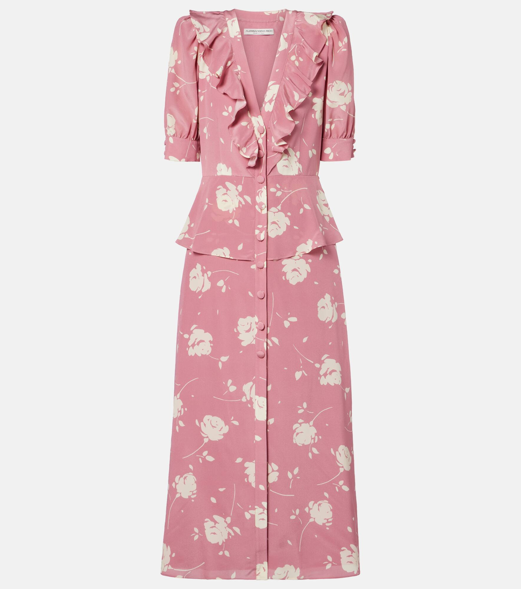 Count on Alessandra Rich for spotlight-stealing looks with feminine flair. Made from soft silk, this charming midi dress features a rose print and elegant ruffled trims at the neckline. Product Details - Material: 100% silk - Care instructions: dry clean - Made in Italy - Designer color name: Pink-White - Item color: pink, white - Lining: 100% polyester - Lining II: 100% polyamide - Closure: partially buttoned front - Collar: V-neck - Shoulder pads - Item number: P01051399 Size & Fit - True to size - Oversized shoulders - Shoulder pad inserts - Cinched waist - Non-stretchy fabric - The model seen in the picture is 178cm-5'10" and wearing a size IT 40