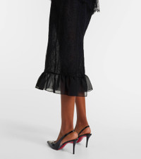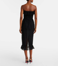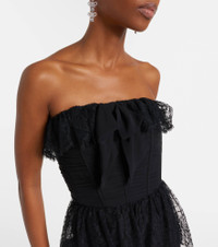 For an unforgettable look at your next special event, Alessandra Rich offers timeless pieces. This bustier dress boasts a lace and silk georgette composition, and its midi silhouette features floral embroideries, ruffled accents, and a charming bow. Product Details - Material: 55% cotton, 45% polyamide - Care instructions: dry clean - Made in Italy - Designer color name: Black - Item color: black - Material II: 100% silk - Lining: 78% polyamide, 22% elastane - Details: 100% mother-of-pearl - Contains non-textile parts of animal origin - Hook-fastening built-in bustier - Boning - Closure: concealed zipper, zipped back, hook-fastening back - Item number: P01051406 Size & Fit - True to size - Strapless - Internal boned corset for support - Fitted - Non-stretchy fabric - The model seen in the picture is 178cm-5'10" and wearing a size IT 40