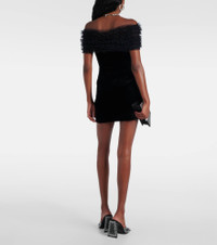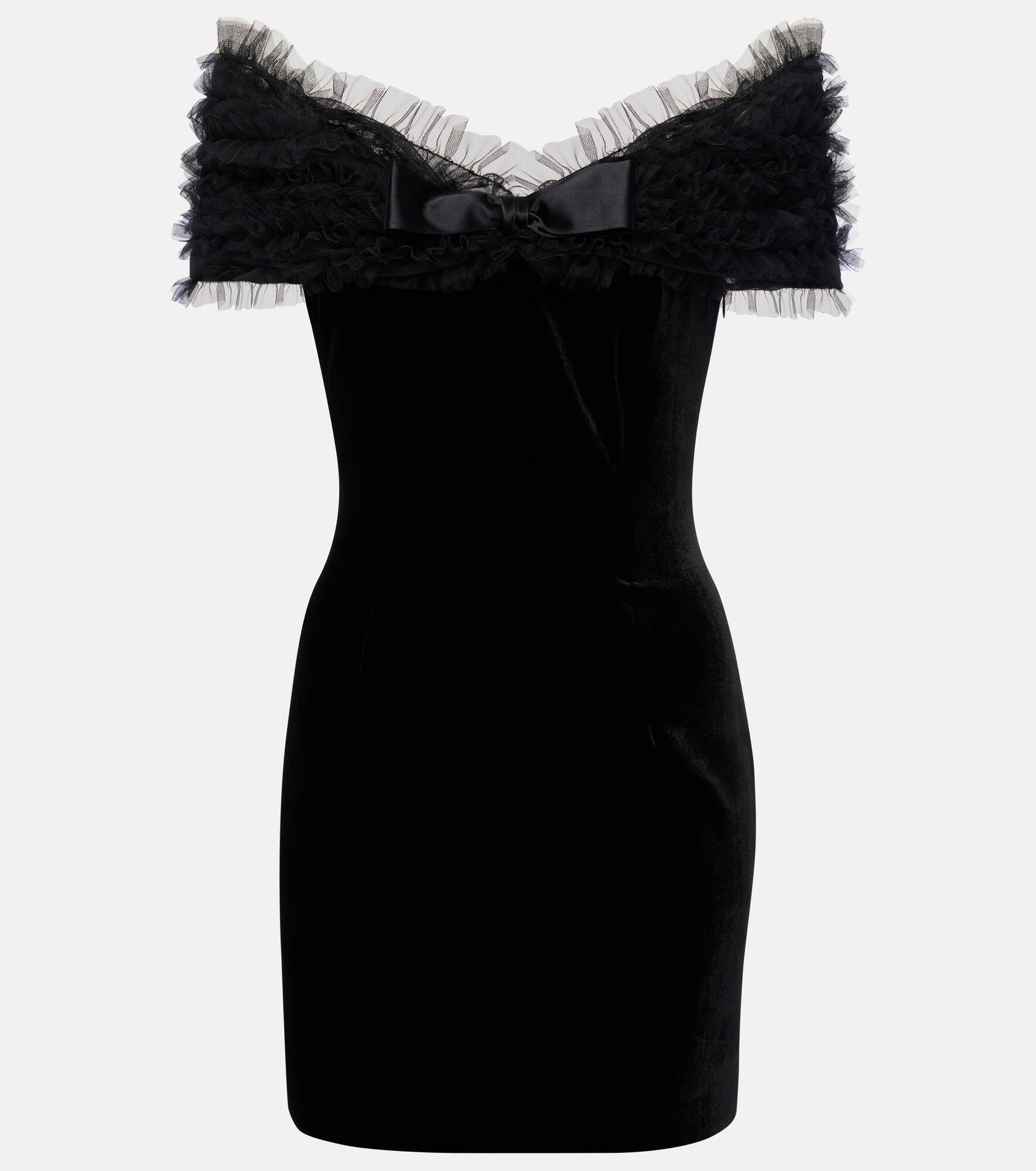 VELVET OFF THE SHOULDER MINI DRESS W/ RUCHED TULLE