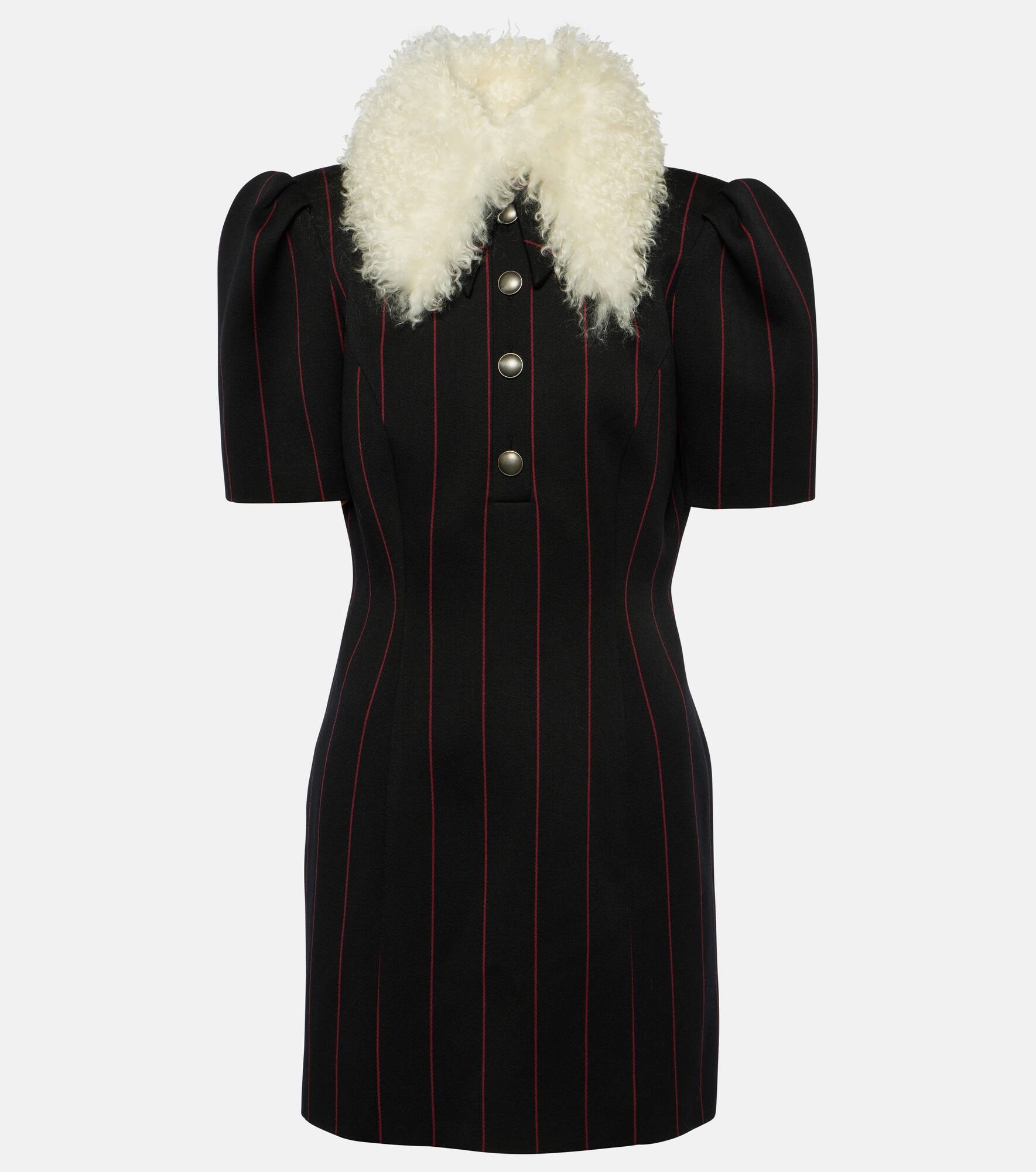 LIGHT WOOL PINSTRIPE MINI DRESS W/ WOOL FUR COLLAR