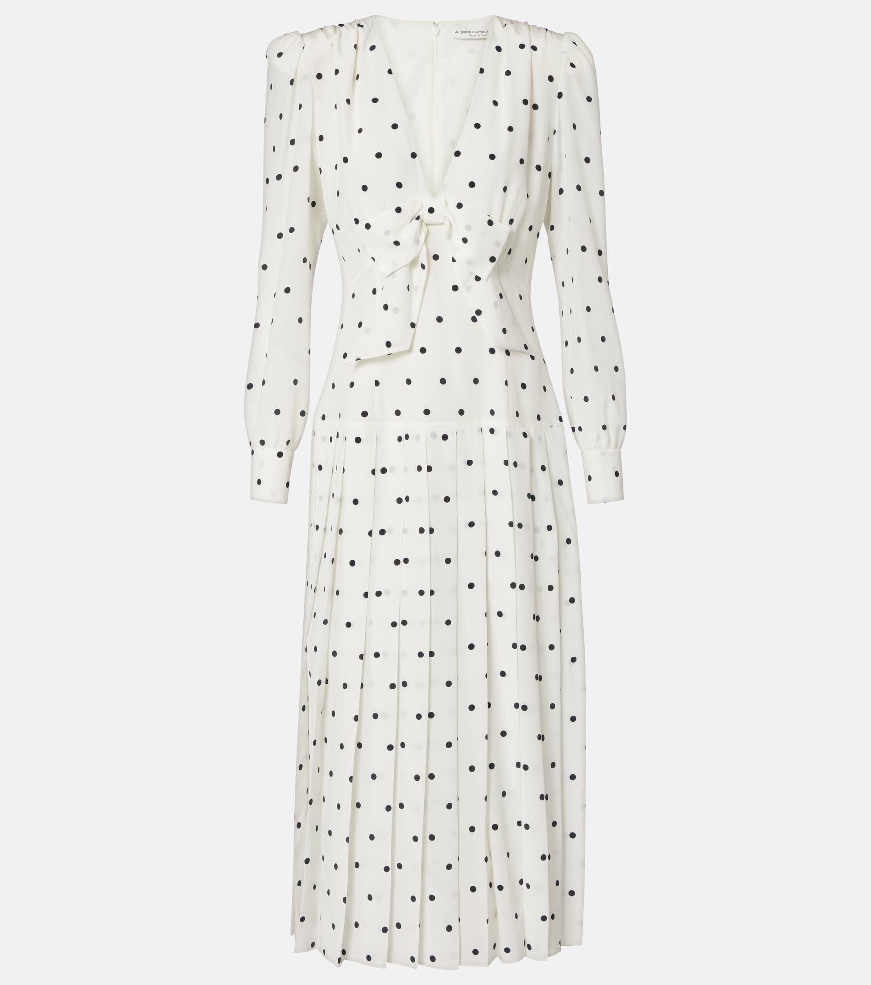 Count on Alessandra Rich for spotlight-stealing looks with feminine flair. This pure silk midi dress has a cinched waist and a pleated skirt, accented with a front bow detail and a subtle polka-dot print. Product Details - Material: 100% silk - Care instructions: dry clean - Made in Italy - Designer color name: White-Navy Blue - Item color: white - Lining: 100% polyester - Lining II: 100% polyamide - Cuff: buttoned - Closure: concealed zipper, hook fastening, zipped back - Item number: P01051366 Size & Fit - True to size - Oversized shoulders - Shoulder pad inserts - Cinched waist - Non-stretchy fabric - The model seen in the picture is 178cm-5'10" and wearing a size IT 40