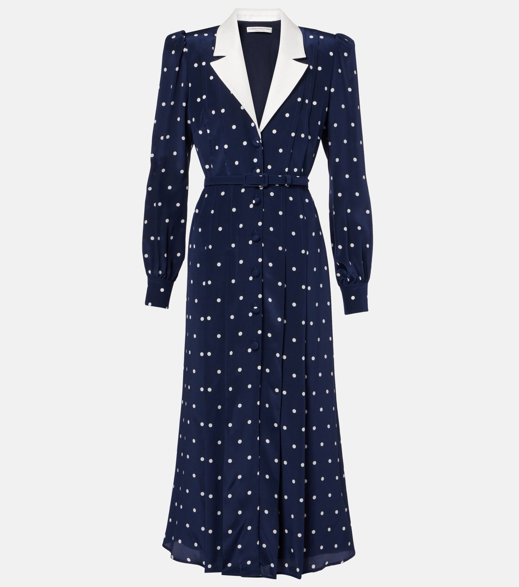 Count on Alessandra Rich for spotlight-stealing looks with feminine flair, like this shirt dress. A lustrous drape of blue silk with a polka dot motif creates the piece, which features structured shoulders and a contrasting peak collar, sculpting the silhouette. Product Details - Material: 100% silk - Care instructions: dry clean - Made in Italy - Designer color name: Navy Blue-White - Item color: blue, white - Trim: 88% cotton, 12% silk - Lining: 100% cupro - Lining II: 100% polyamide - Material II: 100% silk - Details: 100% lamb leather - Contains non-textile parts of animal origin - Notched lapel - Shoulder pads - Closure: buttoned front - Cuff: three buttons - Detachable belt - Fully lined - Item number: P01051360 Size & Fit - True to size - Shoulder pad inserts - Cinched waist - Non-stretchy fabric - The model seen in the picture is 178cm-5'10" and wearing a size IT 40