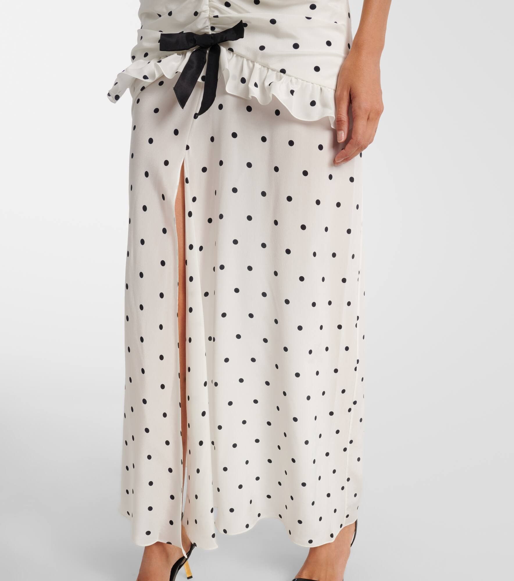 Count on Alessandra Rich for unforgettable looks. This ruched and ruffled maxi dress is made from pure silk and features a playful polka-dotted print. Product Details - Material: 100% silk - Care instructions: dry clean - Made in Italy - Designer color name: White-Navy Blue - Item color: blue, white - Material II: 100% silk - Lining: 100% polyester - Closure: concealed zipper, zipped back, hook fastening - Item number: P01051390 Size & Fit - True to size - Cinched waist - Non-stretchy fabric - The model seen in the picture is 178cm-5'10" and wearing a size IT 40