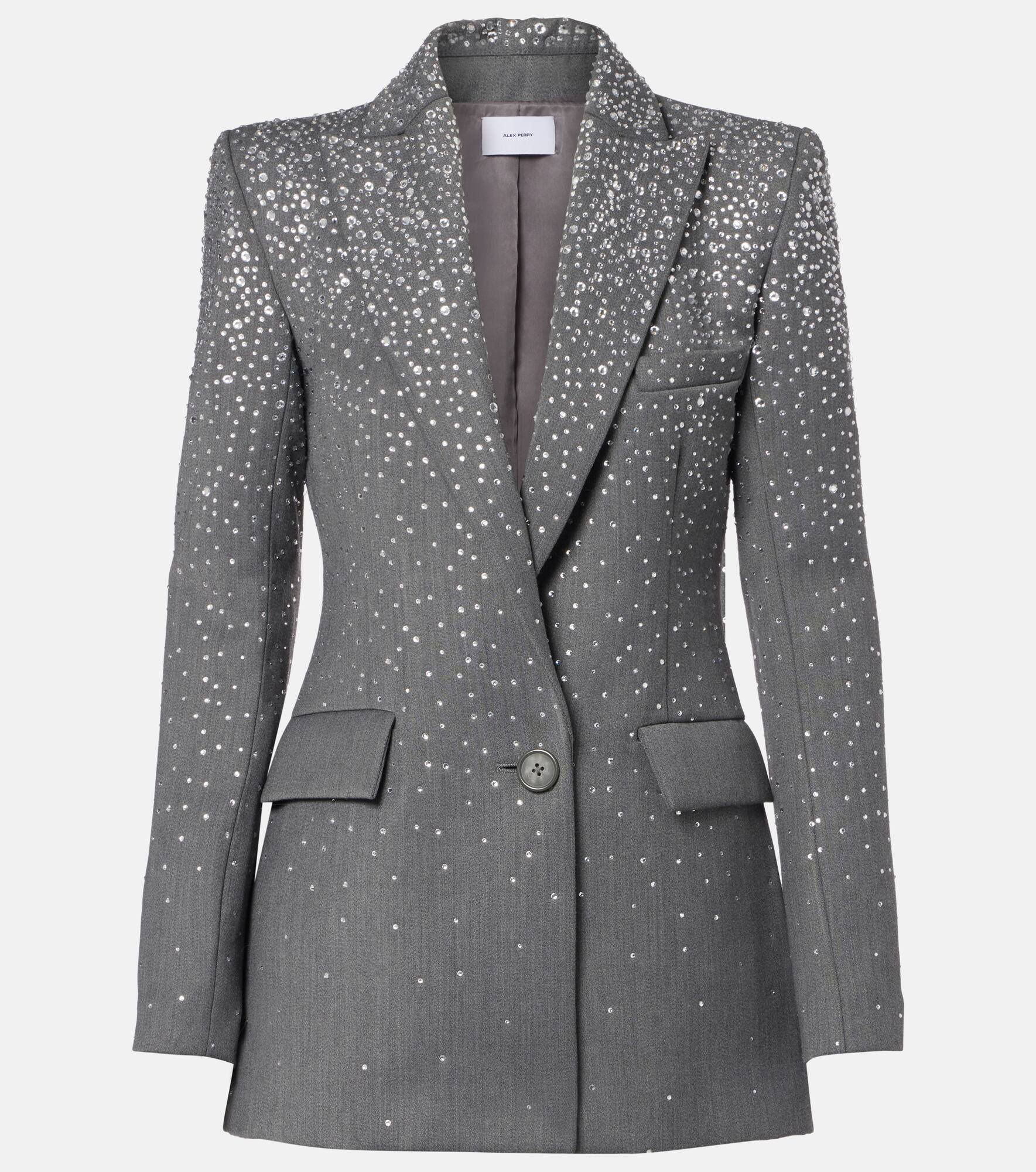 This Alex Perry blazer offers a sculptural look that will make an unforgettable impression. The single-breasted design is tailored to an hourglass silhouette and features padded shoulders and shimmering crystal embellishments. Product Details - Material: 55% polyester, 45% wool - Care instructions: dry clean - Made in China - Designer color name: Slate Grey - Item color: gray - Closure: single-breasted (one button) - Lining: 100% viscose - Peak lapel - Shoulder pads - Pockets: flap pockets - Cuff: buttoned - Vent: double - Item number: P01081162 Size & Fit - True to size - Shoulder pad inserts - Cinched waist - Non-stretchy fabric - Falls below the hip - The model seen in the picture is 178cm-5'10" and wearing a size UK 8