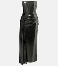 This strapless corset dress by Alex Perry stuns with an asymmetric drape at the hip and an all-over sequin finish. Designed with a carpet-ready silhouette, this piece features a zip-back closure. Product Details - Material: 95% polyester, 5% elastane - Care instructions: dry clean - Made in China - Designer color name: Dark Olive - Item color: green - Lining: 84% acetate, 16% polyester - Boning - Closure: invisible zipper - Item number: P01051497 Size & Fit - True to size - Strapless - Internal boned corset for support - Fitted - Non-stretchy fabric - slit length 48cm-19" - The model seen in the picture is 178cm-5'10" and wearing a size UK 8