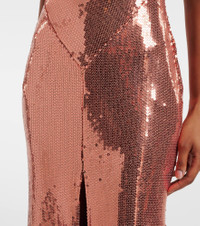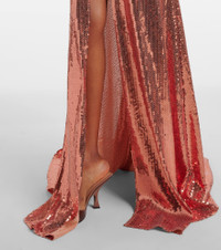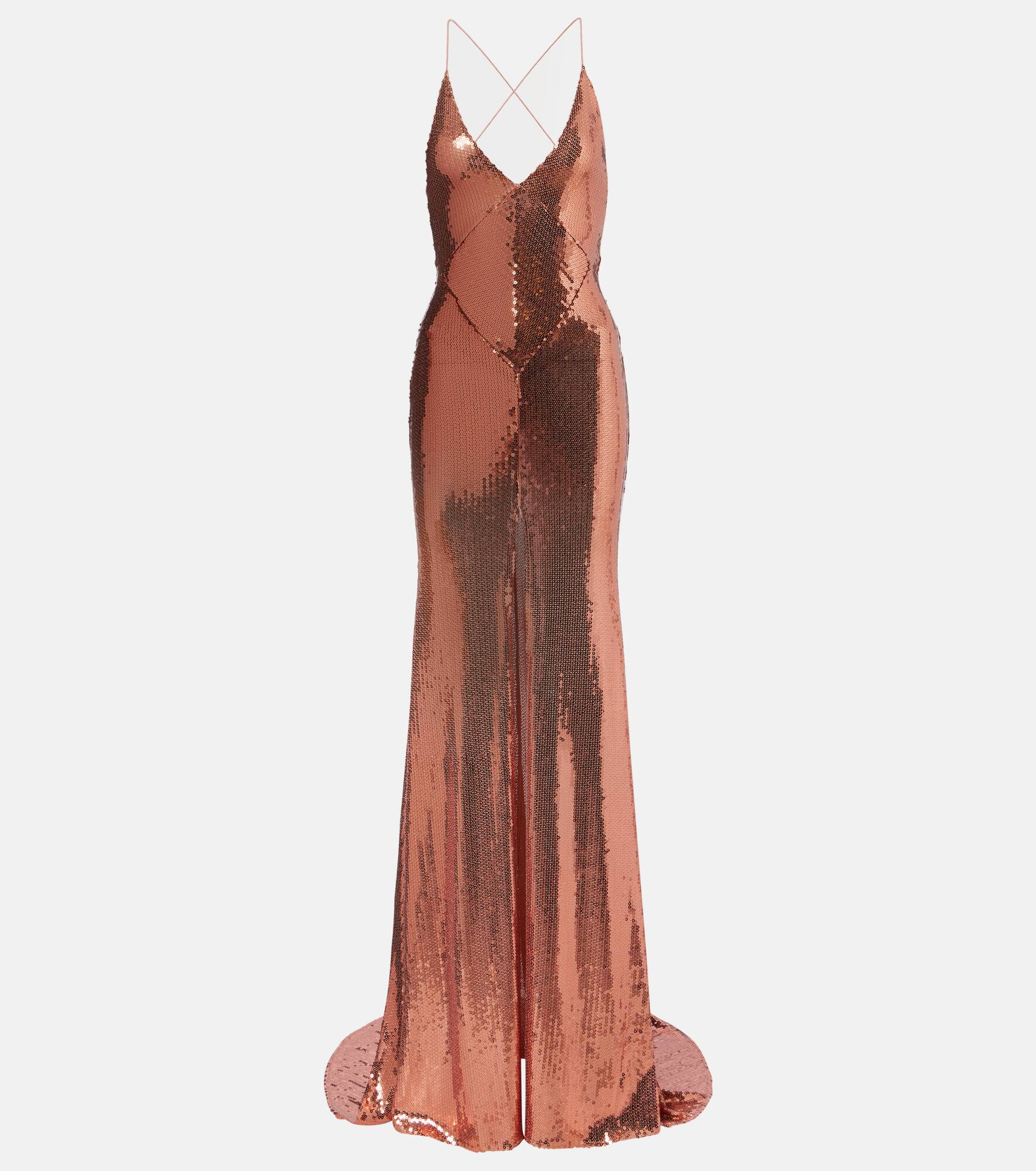 Alex Perry’s designs have lit up the red carpet time and again—and this gown is no exception. Covered in lustrous sequins, this piece features a plunging V-neckline and an open back with delicate cross-back straps. Product Details - Material: 95% polyester, 5% elastane - Care instructions: dry clean - Made in China - Designer color name: Copper - Item color: orange - Closure: invisible zipper - Item number: P01051504 Size & Fit - True to size - Sizing adapted to taller women - Low back - Fitted - Stretchy fabric - slit length 93cm-36.5" - The model seen in the picture is 178cm-5'10" and wearing a size UK 8