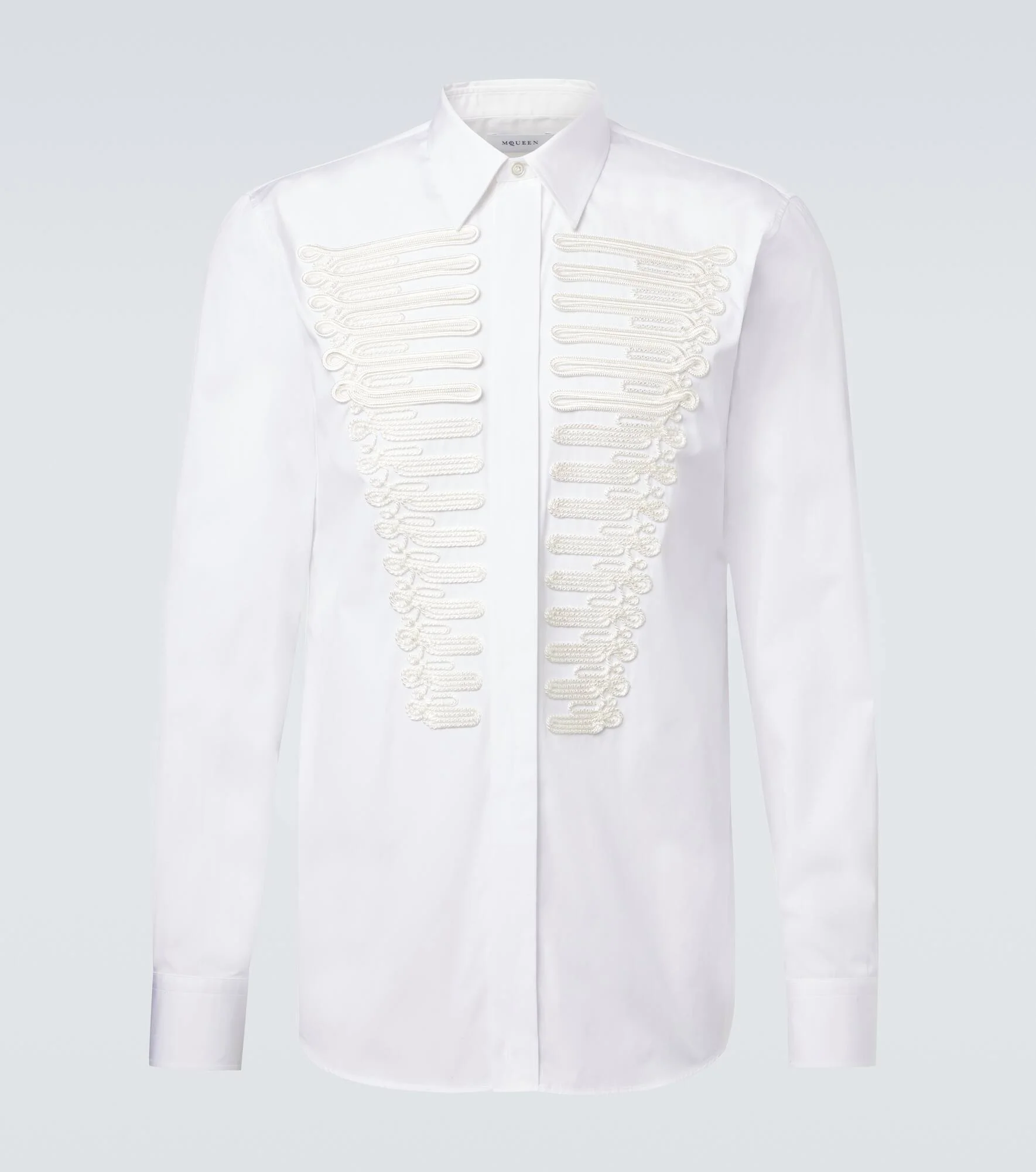 A legacy of the founder's Savile Row training, tailoring lies at the heart of McQueen. Made from crisp cotton poplin, this shirt is defined by the frogging-inspired detailing on the front. Product Details - Material: 100% cotton - Care instructions: dry clean - Made in Romania - Designer color name: Optical White - Item color: white - Embroidery: 100% acetate - Contains non-textile parts of animal origin - Collar: classic (Straight point) - Cuff: buttoned - Closure: buttoned placket - Item number: P01123474 Size & Fit - True to size - With pleats in the back - Classic fit - Non-stretchy fabric - Falls below the hip - Height of model is 192cm-75.5" and wears a size 16