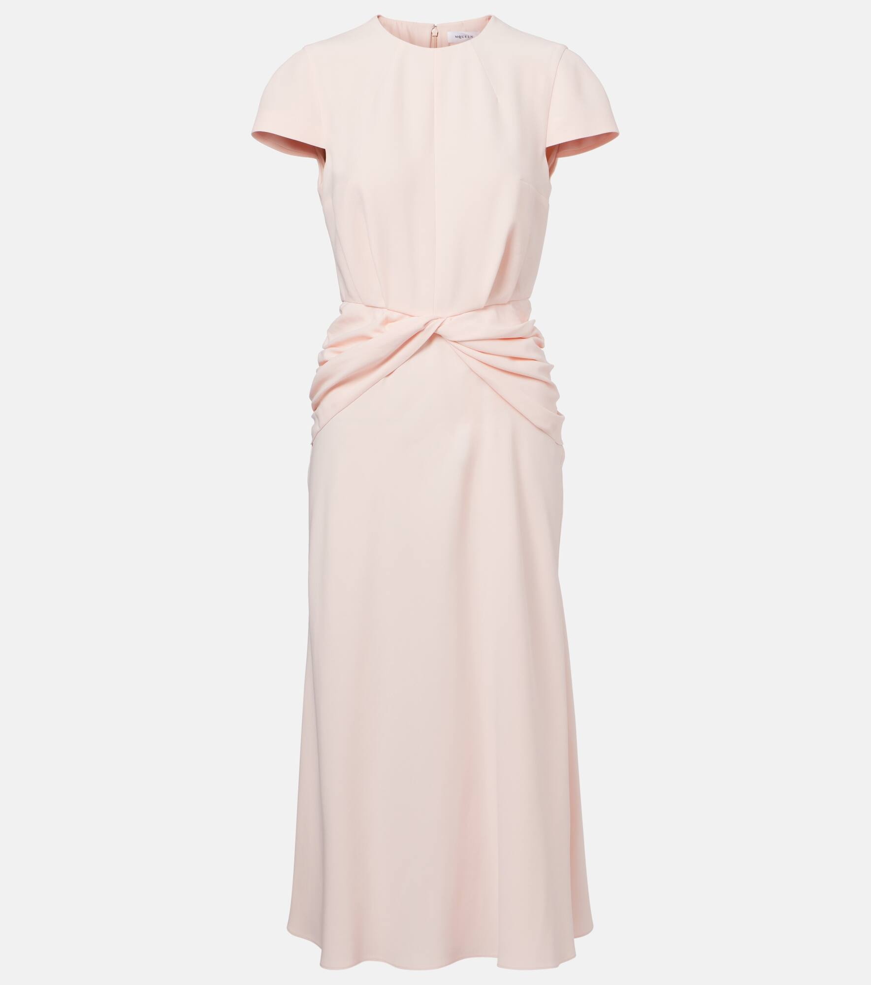 Crafted from leaf crepe in an elegant light pink color, this midi dress from McQueen features short sleeves and charming knotted details at the waist. The design is complete with a rounded neckline and back zipper closure. Product Details - Material: 52% viscose, 48% acetate - Care instructions: dry clean - Made in Italy - Designer color name: 5119 Venus - Item color: pink - Lining: 74% acetate, 26% silk - Closure: zipped back - Item number: P01064314 Size & Fit - True to size - Cinched waist - Non-stretchy fabric - The model seen in the picture is 178cm-5'10" and wearing a size IT 40