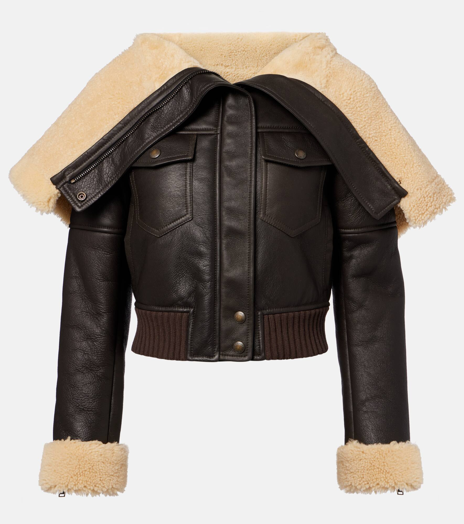 Made in Italy with leather, this McQueen jacket has a cropped fit with a zipper and snap-button fastening. The design is finished with contrasting shearling trims on the sleeves and an oversized statement collar. Product Details - Material: 100% shearling - Care instructions: specialist clean - Made in Italy - Designer color name: Dark Brown/Cream - Item color: brown, beige - Material II: 100% lamb leather - Trim: 92% cotton, 6% polyamide, 2% elastane - Contains non-textile parts of animal origin - Closure: zipper, snap-button fastenings - Pockets: patch pockets - Hem: knit - Includes: garment bag - Item number: P01064289 Size & Fit - True to size - Straight fit - Elasticated hem - Non-stretchy fabric - Slightly cropped - The model seen in the picture is 178cm-5'10" and wearing a size IT 40