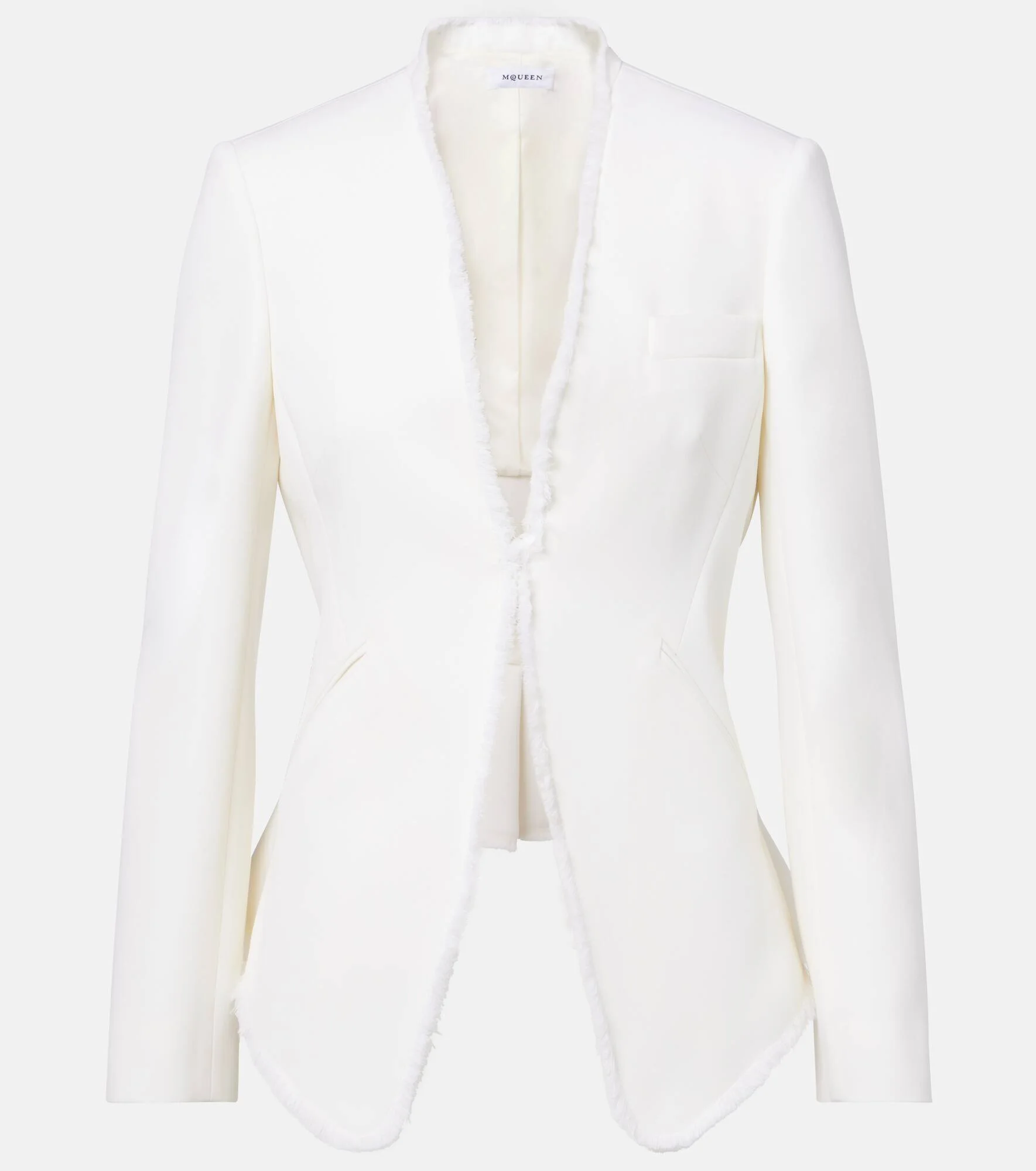 A legacy of the founder's Savile Row training, tailoring lies at the heart of McQueen. This blazer is made in Italy with wool gabardine and features shoulder pads and frayed edges for an intricate spin on a classic design. Product Details - Material: 100% wool - Care instructions: dry clean - Made in Italy - Designer color name: Ivory - Item color: white - Lining: 100% cupro - Collarless - Cuff: four buttons - Closure: hook fastening - Shoulder pads - Pockets: welt pocket, jetted - Frayed ends - Item number: P01064287 Size & Fit - True to size - Shoulder pad inserts - Cinched waist - Non-stretchy fabric - Falls to the hip - The model seen in the picture is 178cm-5'10" and wearing a size IT 40