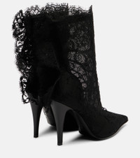 McQueen blends avant-garde design with refined craftsmanship to create iconic, statement-making pieces. Set on 105mm stiletto heels, the Heron ankle boots are adorned with intricate lace embroidery and feature sharp pointed toes. Product Details - Upper: fabric - Lining: fabric - Sole: leather insole and sole - Toe shape: pointed toe - Made in Italy - Includes: shoe box, dust bags - Designer color name: Black/Black/Black - Item color: black - Item number: P01100659 Size & Fit - True to size - European sizes - 10,5cm-4" heel (size EU 38)