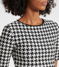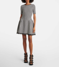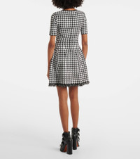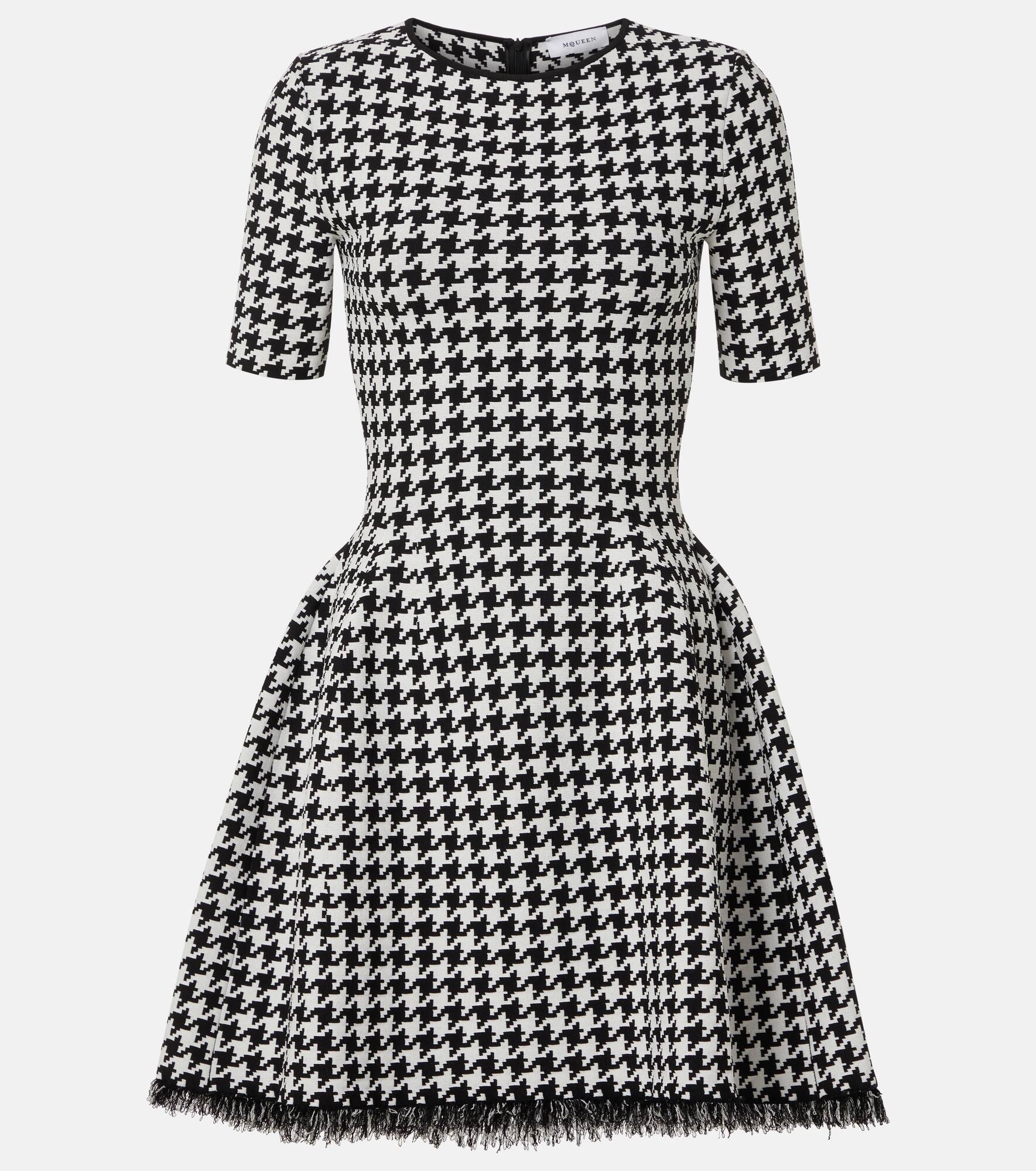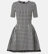 This midi dress from Alexander McQueen features a houndstooth pattern and short sleeves. It has a fringed hem and a zipper at the back for closure. Product Details - Material: 77% viscose, 16% polyester, 5% polyamide, 2% elastane - Care instructions: dry clean - Made in Italy - Designer color name: Black/Ivory - Item color: black - Collar: crewneck - Closure: zipped back - Sleeves: short-sleeved - Item number: P01031268 Size & Fit - True to size - Relaxed fit from the hip down - Stretchy fabric - The model seen in the picture is 178cm-5'10" and wearing a size XS