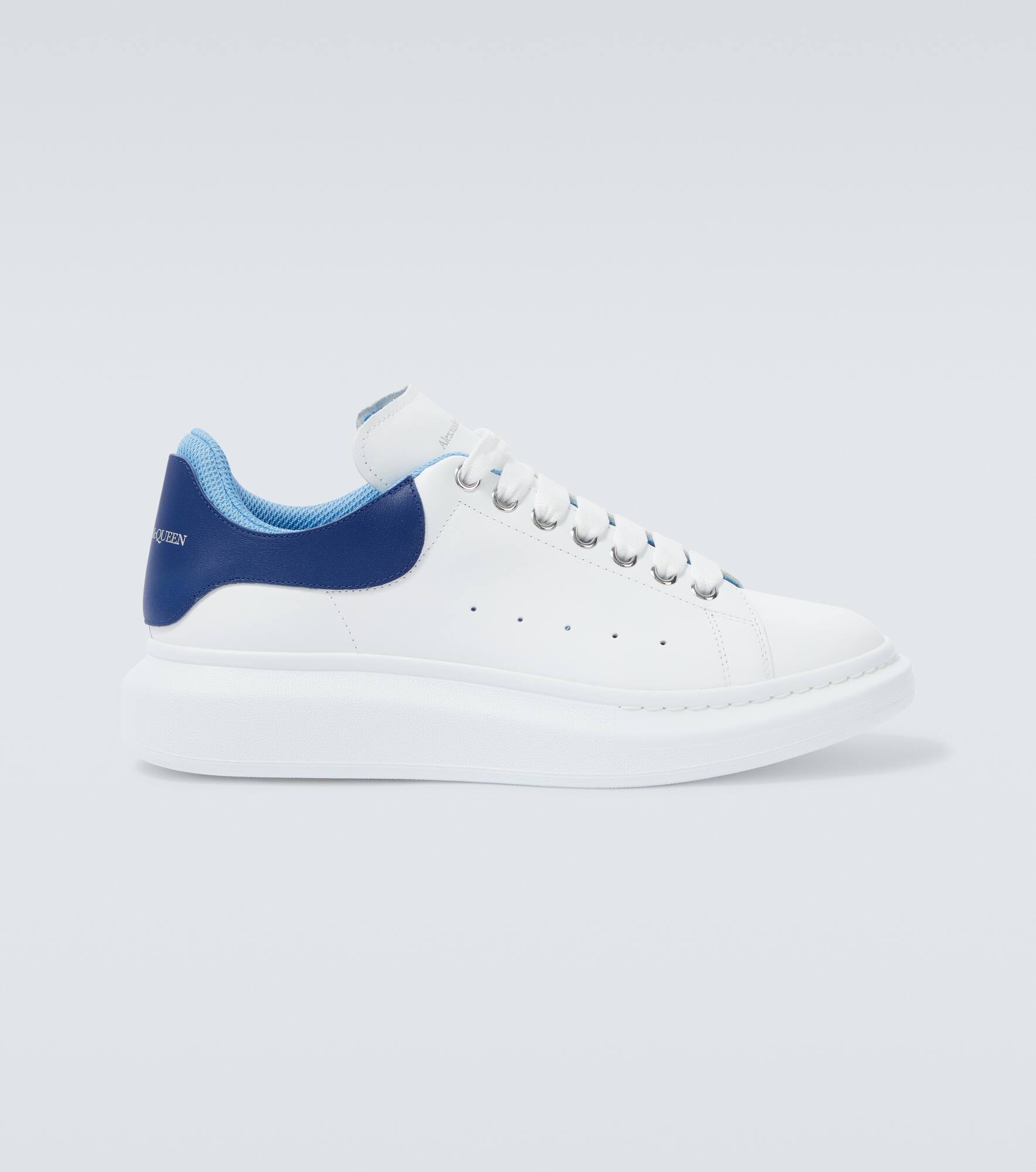 McQueen's low-top sneakers are crafted from leather with oversized rubber soles. An iconic style from the brand, this pair is finished with white laces and blue leather heel counters. Product Details - Upper: leather - Lining: fabric - Sole: leather insole, rubber sole - Toe shape: round toe - Made in Italy - Includes: shoe box, extra laces - Designer color name: White/Blue/Azul - Item color: white, blue - Item number: P01079659 Size & Fit - True to size - European sizes
