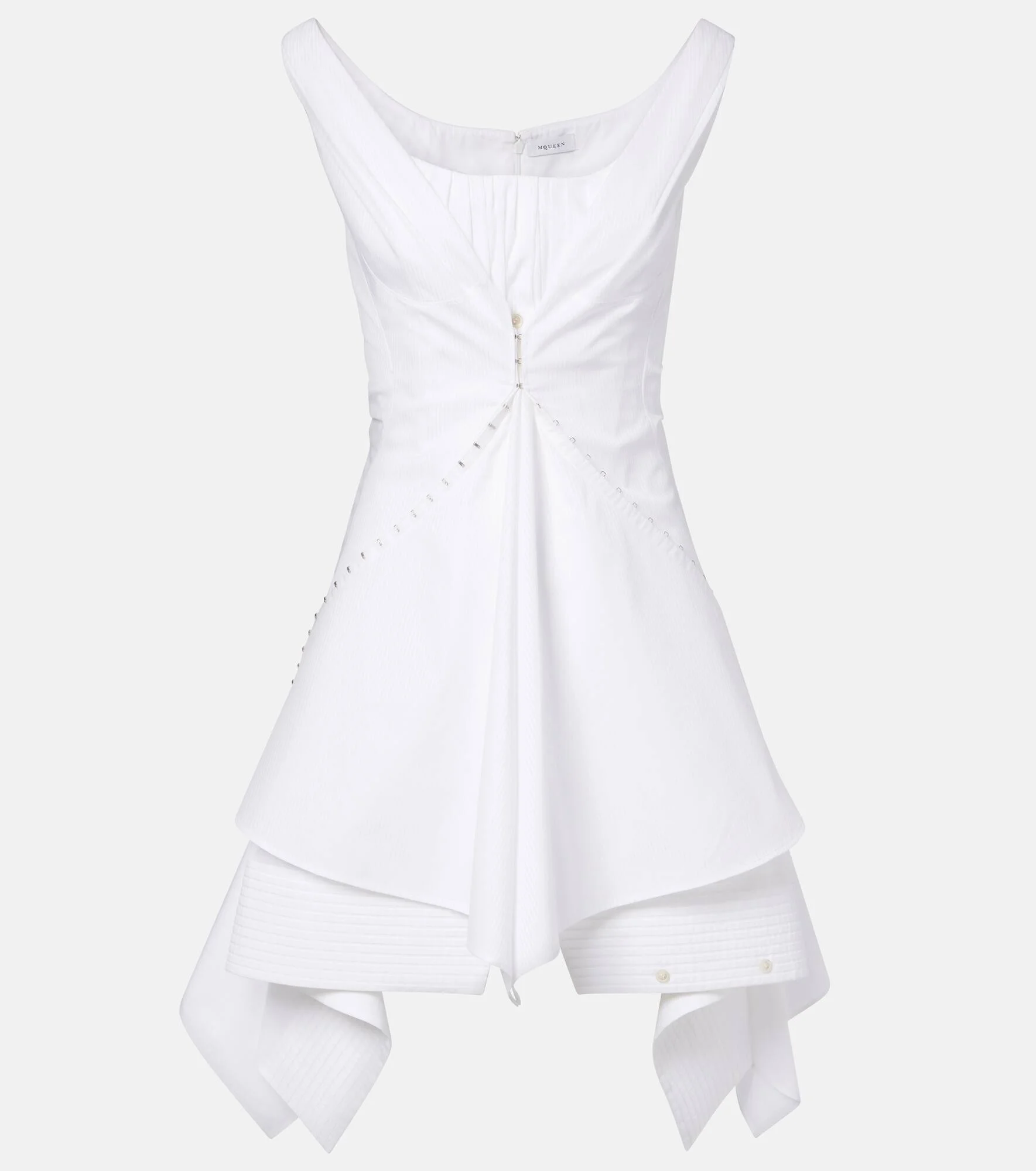 McQueen is celebrated for its uncompromising expression of individuality, subversive strength, and provocative elegance. This cotton minidress features a striped texture and ruffled trims that add volume to the look. Product Details - Material: 100% cotton - Care instructions: dry clean - Made in Italy - Color: white - Designer color name: Optical White - Closure: hook-fastening front, concealed zipped back - Built-in bustier - Hem: uneven - Boning - Item number: P01144996