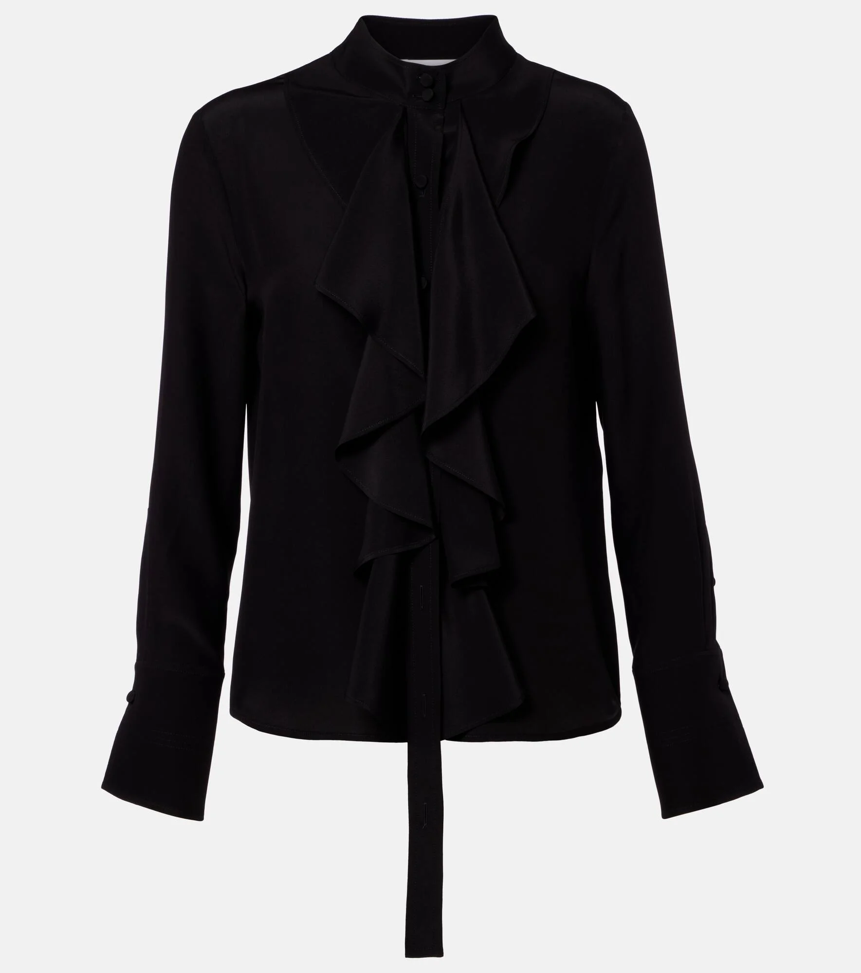 Showcasing McQueen's coveted aesthetic, this blouse is primed for elegant everyday looks. Made from soft silk, the style is complete with ruffled detailing. Product Details - Material: 100% silk - Care instructions: dry clean - Made in Italy - Color: black - Designer color name: 1000 - Item color: black - Closure: buttoned front - Cuff: buttoned - Item number: P01122012