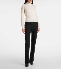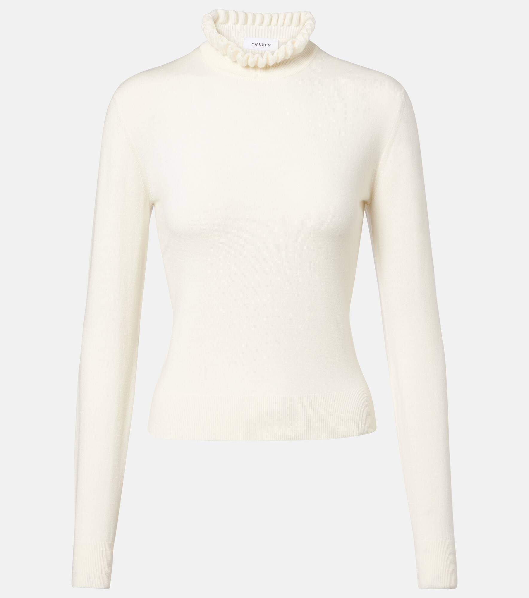 Simple yet sophisticated, this McQueen sweater is knitted from a fine wool-blend. The long-sleeved design features a charming scalloped high collar and ribbed details for a refined finish. Product Details - Material: 95% wool, 5% polyester - Care instructions: dry clean - Made in Italy - Designer color name: Ivory - Item color: white - Trim: 81% wool, 14% polyamide, 4% polyester, 1% elastane - Collar: turtleneck - Cuff: ribbed - Hem: ribbed - Item number: P01101337 Size & Fit - True to size - Straight fit - Elasticated hem - Stretchy fabric - Falls to the hip - The model seen in the picture is 178cm-5'10" and wearing a size XS
