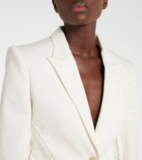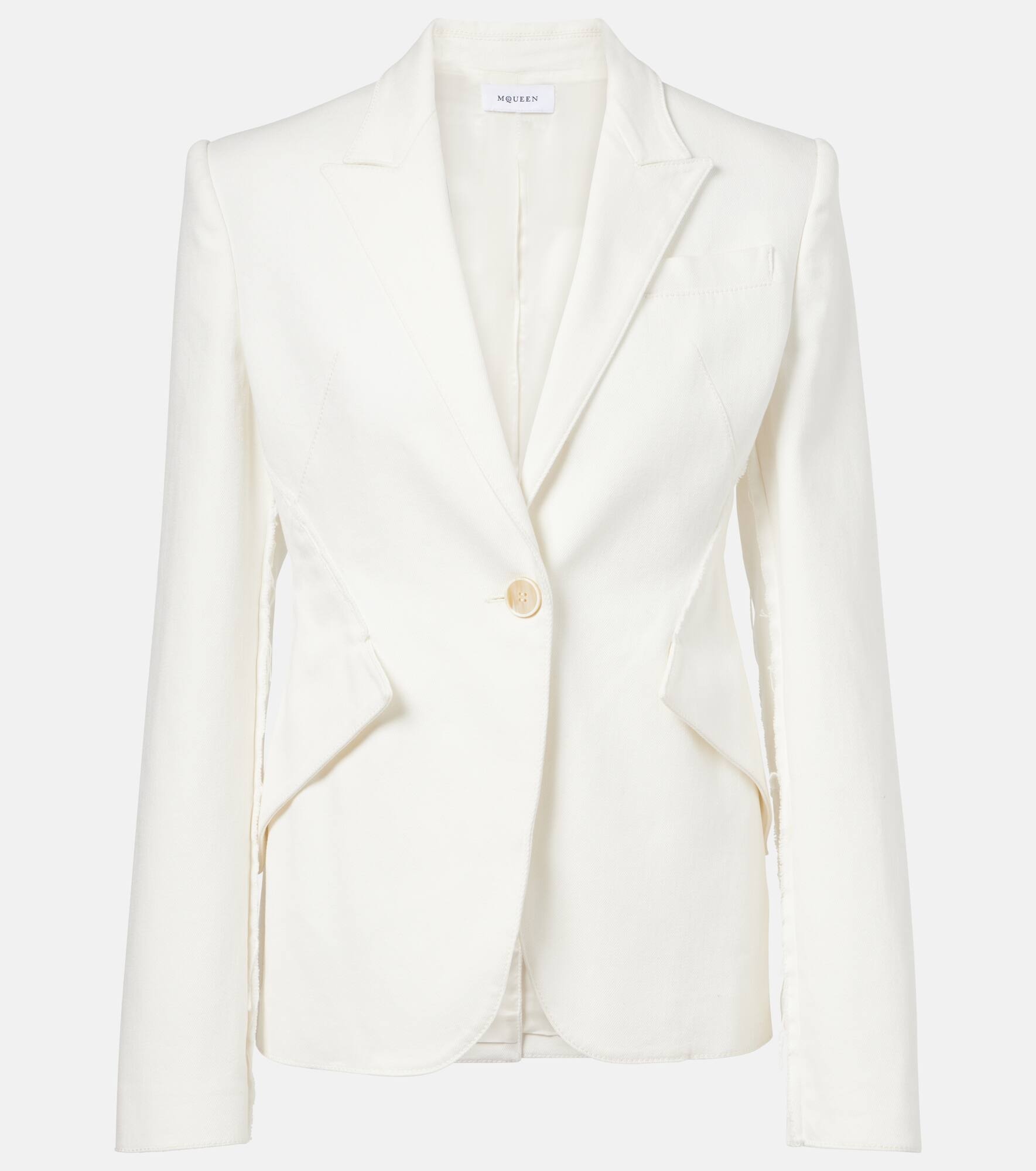 Crafted in Italy from pure cotton, this single-breasted denim blazer from Alexander McQueen features notch lapels and raw edges. It has two side flap pockets and a chest pocket and is finished with tonal topstitching. Product Details - Material: 98% cotton, 2% elastane - Care instructions: dry clean - Made in Italy - Designer color name: Optical White - Item color: white - Peak lapel - Closure: single-breasted (one button) - Pockets: flap pockets - Item number: P01031263 Size & Fit - True to size - Shoulder pad inserts - Cinched waist - Non-stretchy fabric - Falls to the hip - The model seen in the picture is 178cm-5'10" and wearing a size IT 40