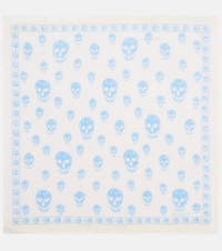 This McQueen scarf is made in Italy from pure silk to a square silhouette. The piece is decorated with a Skull motif, which nods to the brand's fascination with the macabre. Product Details - Material: 100% silk - Care instructions: dry clean - Made in Italy - Color: white - Designer color name: Ivory/Sky Blue - Item color: white, blue - Item number: P01142575