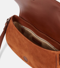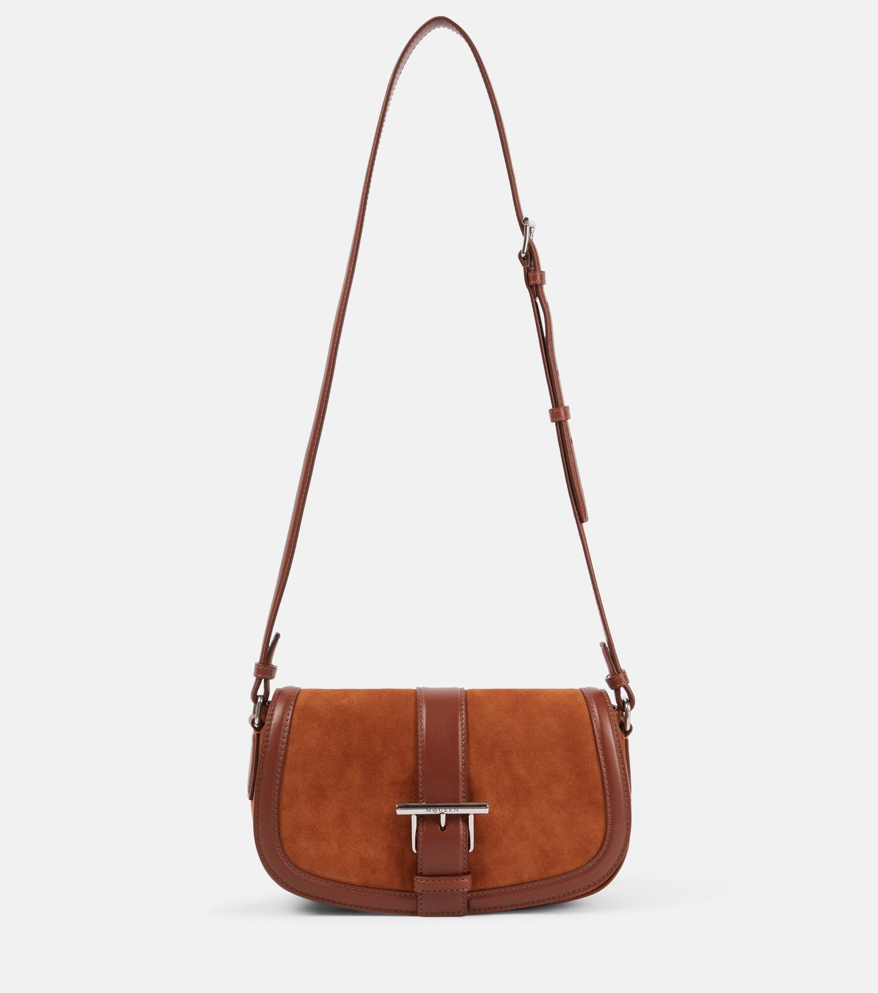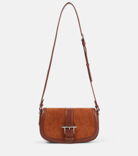 Crafted in Italy, the T-bar suede shoulder bag from Alexander McQueen features the brand name on the buckle. It also has a card slot inside and an adjustable shoulder strap. Product Details - Material: leather (suede) - Lining: fabric - Made in Italy - Designer color name: Dark Brown/Silver - Item color: brown - Internal details: single compartment, card slot - Adjustable shoulder strap - Closure: magnetic fastening - Hardware color: silver - Item number: P01036437 Size & Fit - Height 16cm-6.5" - Width 27cm-10.5" - Max. depth 7cm-3" - Adjustable shoulder strap - Min. length shoulder strap 99cm-39" - Max. length shoulder strap 119cm-47"