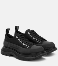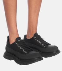 Following the Tread boots, Alexander McQueen presents the Tread Slick sneakers for SS20. Blurring the lines between shoes and trainers, the lace-up, canvas upper gives way to an outsized and elevated rubber sole. Wear yours with cropped hemlines to keep them in focus. Product Details - Lining: leather - Upper: fabric - Sole: leather insole, rubber sole - Toe shape: round toe - Closure: lace-up - Designer color name: Black/Black/Black - Made in Italy - Item number: P00480578 Size & Fit - Fits slightly large to size - we recommend trying a half size smaller - European sizes - 3cm-1" platform (size EU 38) - 4,5cm-2" wedge heel (size EU 38)