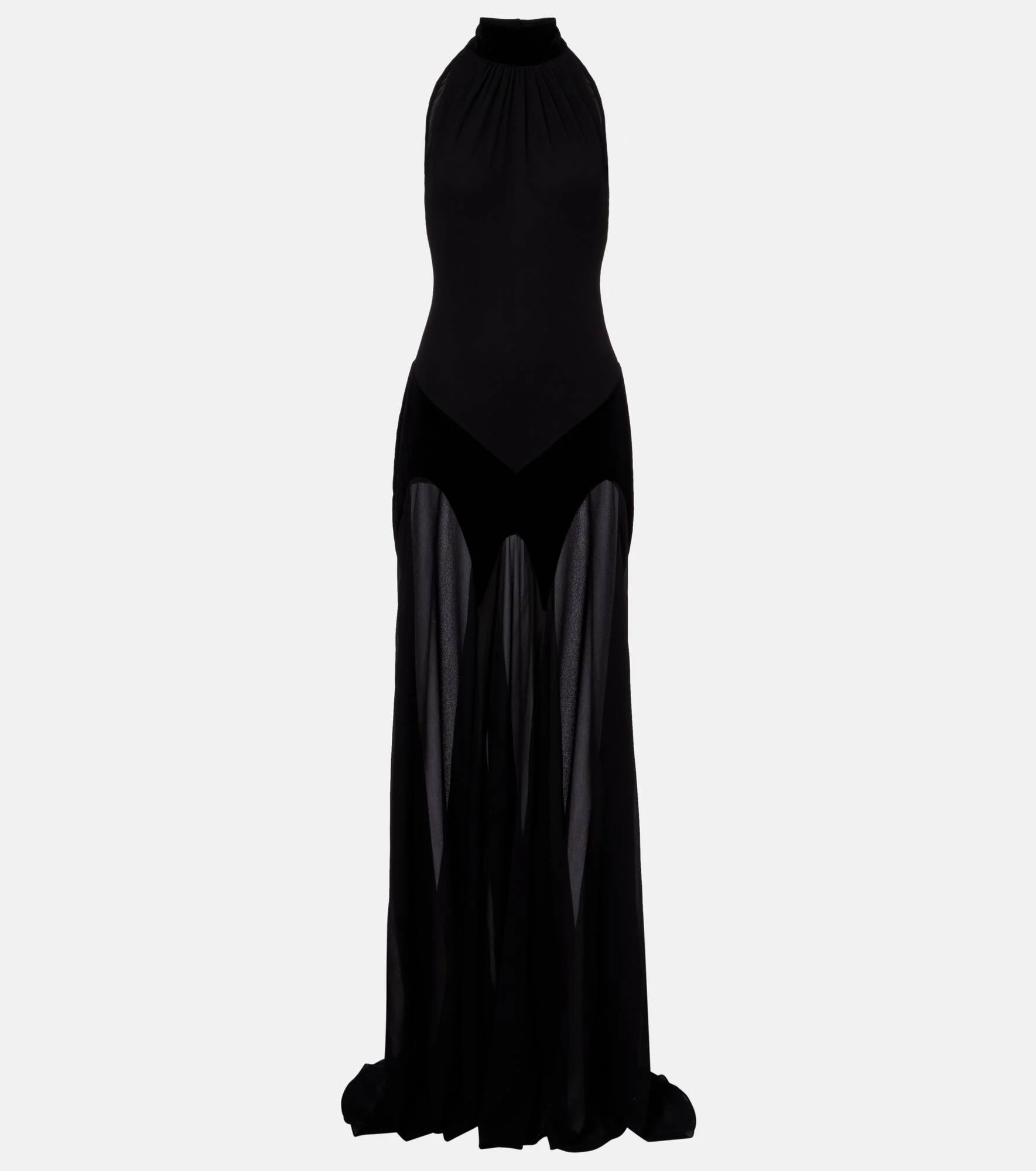 McQueen is celebrated for its uncompromising expression of individuality, subversive strength, and true power. Italian-crafted from fluid silk georgette, this high-neck gown features soft cotton velvet paneling, artful gathering, and a semi-sheer skirt. Product Details - Material: 100% silk - Care instructions: dry clean - Made in Italy - Designer color name: Black - Item color: black - Material II: 100% cotton - Closure: concealed zipped back - Item number: P01101291 Size & Fit - True to size - Fitted - Non-stretchy fabric - The model seen in the picture is 178cm-5'10" and wearing a size IT 40