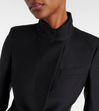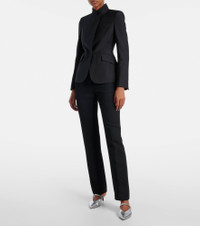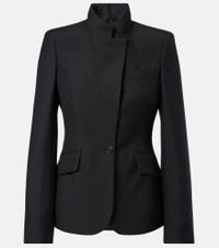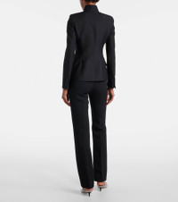Crafted from wool and mohair, this jacket from McQueen features a sleek, tailored silhouette perfect for elevated ensembles. The design is complete with shoulder pads, flap pockets, and a flattering collared high neckline. Product Details - Material: 75% wool, 25% mohair - Care instructions: dry clean - Made in Italy - Designer color name: Black - Item color: black - Lining: 100% cupro - Pockets: flap pockets, breast pocket, internal pocket - Shoulder pads - Cuff: four buttons - Sleeves: long-sleeved - Tailored fit - Contains non-textile parts of animal origin - Item number: P01064296 Size & Fit - True to size - Shoulder pad inserts - Cinched waist - Non-stretchy fabric - Falls below the hip - The model seen in the picture is 178cm-5'10" and wearing a size IT 40