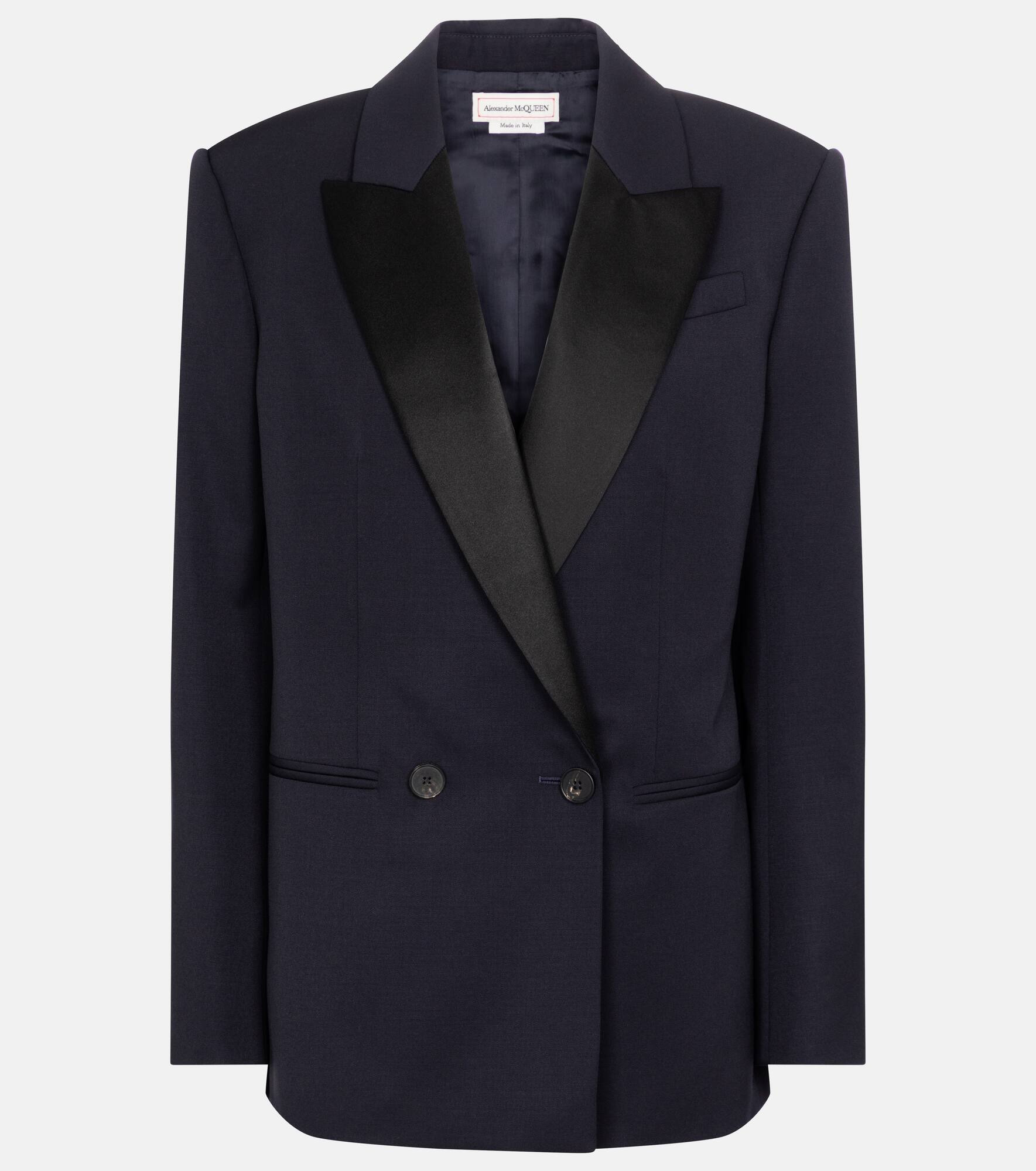 Reinterpreting menswear tailoring silhouettes for the modern woman is an Alexander McQueen specialty, and this navy blazer from the Pre-Fall '21 collection is a case in point. Made in Italy from wool, it has a boxy silhouette with padded shoulders that accentuate the frame, and is finished with black satin lapels. - material: 100% wool - details: 77% silk, 23% polyester - lining: 100% cupro, fully lined - care instructions: dry clean - slit pockets, breast pocket - button fastening - Made in Italy - buttoned cuffs - shoulder pads - Designer colour name: Navy - contains non-textile parts of animal origin