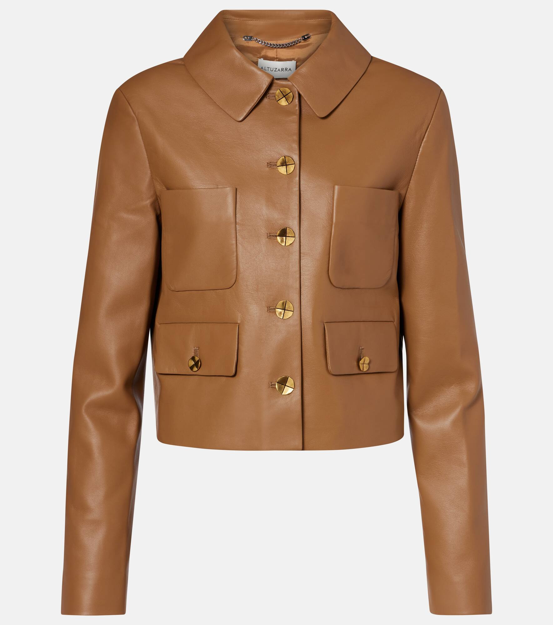 A modern statement piece with timeless appeal, the Astley jacket from Altuzarra is crafted from supple leather in a slightly cropped silhouette. Two-tone buttons adorn the front and cuffs like jewelry-inspired accents. Product Details - Material: 100% lamb leather - Care instructions: specialist clean - Made in Turkey - Designer color name: Saddle - Item color: brown - Lining: 67% viscose, 33% polyester - Hardware color: gold - Collar: classic (Straight point) - Cuff: three buttons - Pockets: buttoned pockets, patch pockets - Closure: buttoned front - Item number: P01070867 Size & Fit - True to size - Straight fit - Non-stretchy fabric - Slightly cropped - The model seen in the picture is 178cm-5'10" and wearing a size FR 36