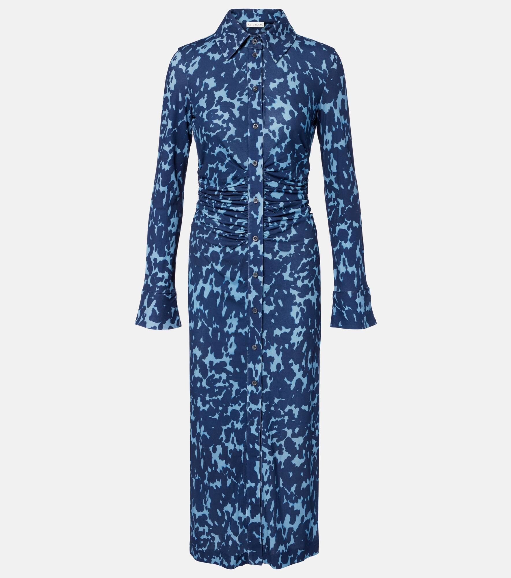 Informed by founder Joseph Altuzarra’s multicultural upbringing, each Altuzarra piece speaks to the power of considered elegance. The Claudia jersey shirt dress is tailored to a midi silhouette with ruched detailing at the waist and a stunning print. Product Details - Material: 100% viscose - Care instructions: dry clean - Made in Portugal - Designer color name: Ash Blue Tortoise - Item color: blue - Closure: buttoned front - Collar: classic (Straight point) - Item number: P01070877 Size & Fit - True to size - Cinched waist - Slightly stretchy fabric - The model seen in the picture is 178cm-5'10" and wearing a size FR 36