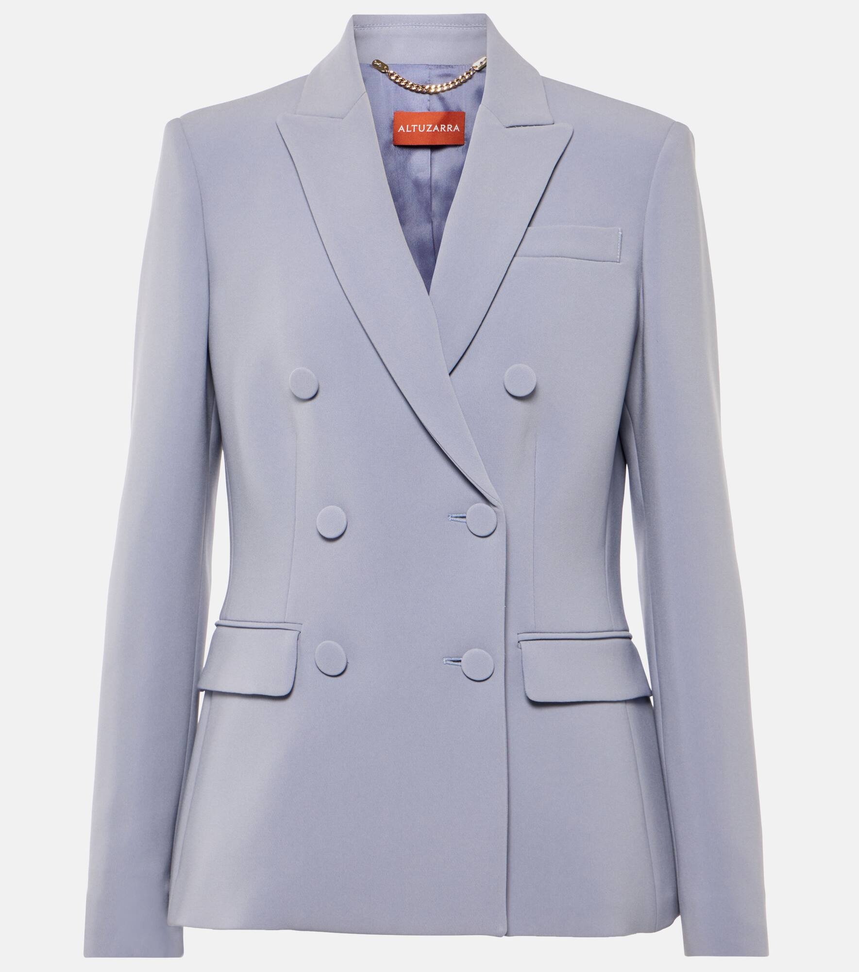 Product Details - Material: 69% triacetate, 31% polyester - Buttoned cuffs - Care instructions: dry clean - Made in Italy - Designer color name: Eventide - Lining: 67% viscose, 33% polyester - Closure: double-breasted (six buttons) - Pockets: flap pockets, angled chest pocket - Item number: P00877526 Size & Fit - True to size - Shoulder pad inserts - Cinched waist - Non-stretchy fabric - Falls to the hip - The model seen in the picture is 178cm-5'10" and wearing a size FR 36