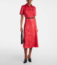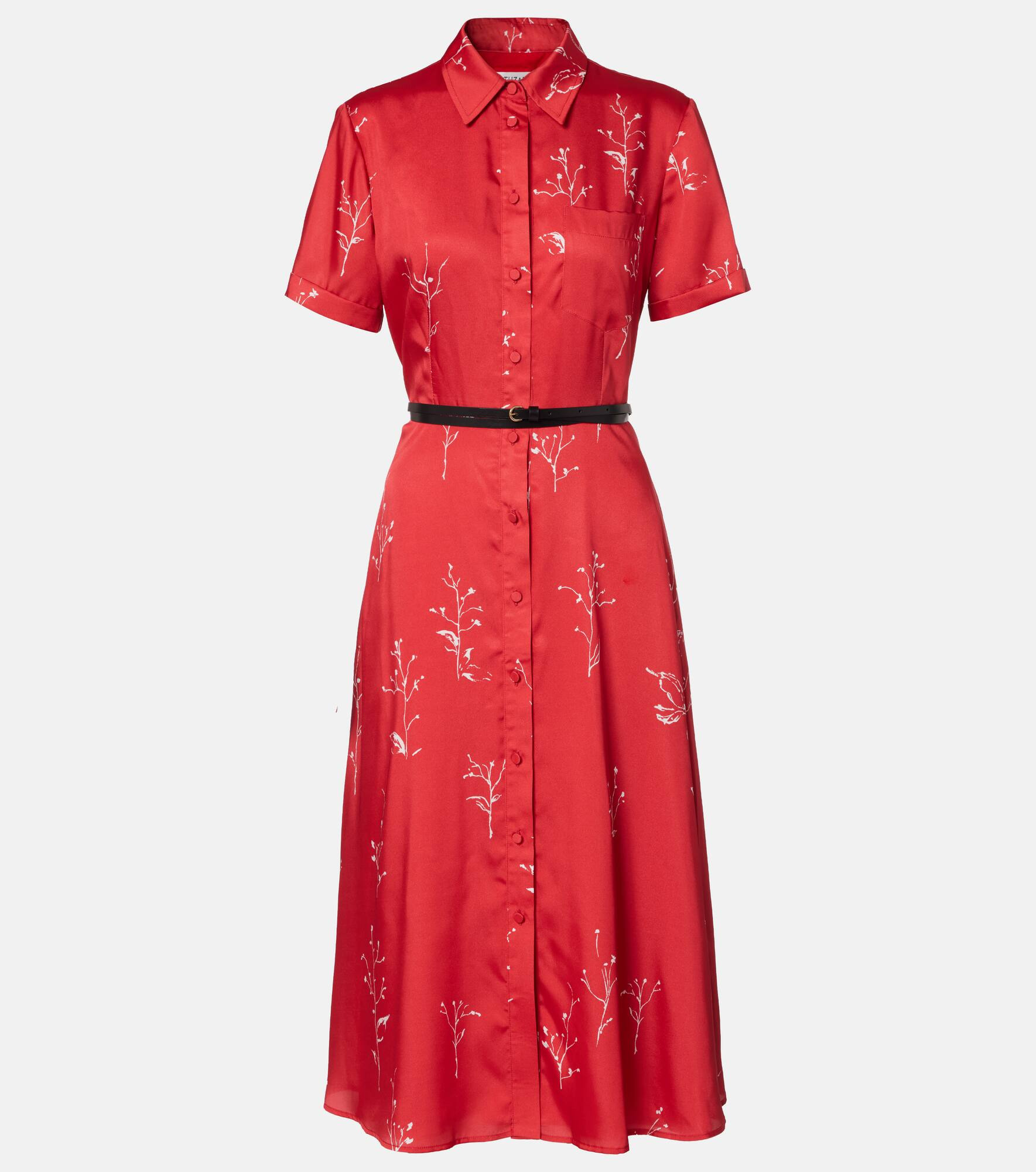 Each Altuzarra piece expresses the power of considered elegance. The Kiera midi dress is made from pure, lustrous silk with a delicate print, a buttoned front, and a slim belt to cinch the waist. Product Details - Material: 100% silk - Care instructions: dry clean - Made in Italy - Designer color name: Grenadine Botanical - Item color: red - Lining: 100% polyester - Collar: classic (Straight point) - Pockets: angled chest pocket - Attached belt - Closure: buttoned front - Item number: P01070820 Size & Fit - Fits large to size - we recommend trying one size smaller - Cinched waist - Non-stretchy fabric - The model seen in the picture is 178cm-5'10" and wearing a size FR 34