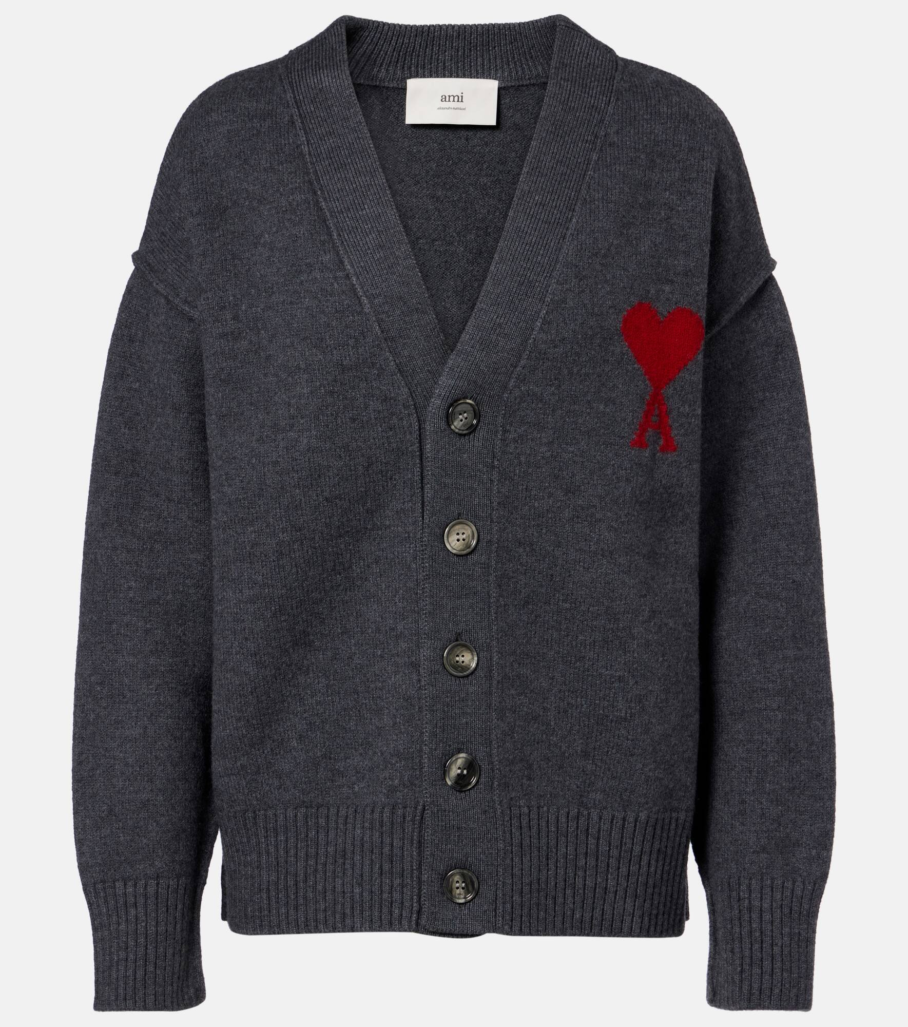 A symbol of Ami Paris since 2016, the Ami de Cœur logo is named after the French expression for "friend of the heart". Embroidered on this virgin wool cardigan, the design is finished with a buttoned front and ribbed trims. Product Details - Material: 100% virgin wool - Care instructions: dry clean - Made in Portugal - Designer color name: Gris Chine Rouge - Item color: gray - Collar: V-neck - Closure: buttoned front - Cuff: ribbed - Hem: ribbed - Item number: P01074106 Size & Fit - True to size - For a closer fit, we recommend taking one size down - Dropped shoulders - Designed for a loose fit - Stretchy fabric - Falls below the hip - The model seen in the picture is 178cm-5'10" and wearing a size XS