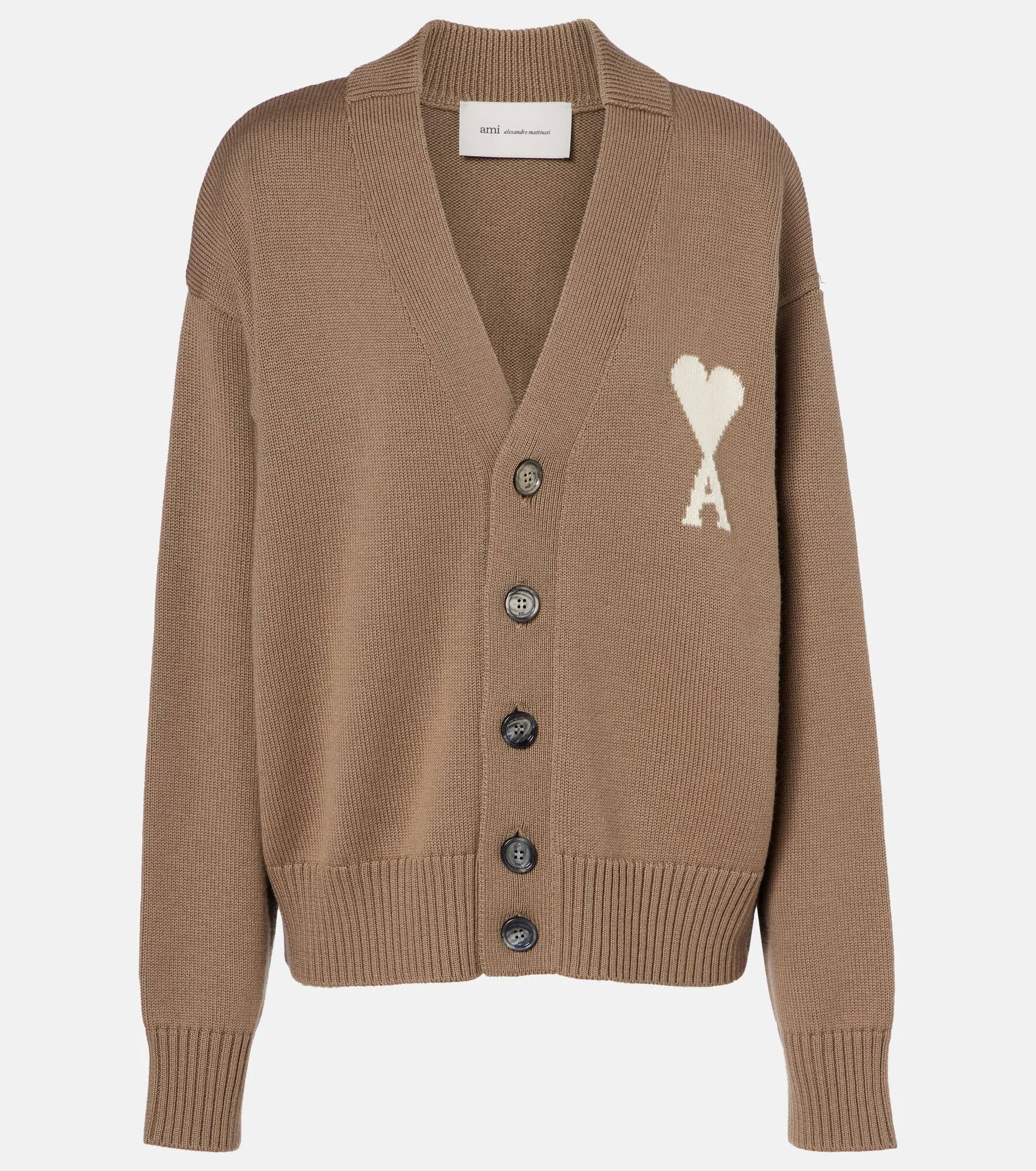 A symbol of Ami Paris since 2016, the Ami de Cœur logo is named after the French expression for "friend of the heart". Embroidered on this wool and cotton cardigan, the design is finished with a buttoned front and ribbed trims. Product Details - Material: 53% wool, 47% cotton - Care instructions: hand wash cold - Made in Italy - Color: beige - Designer color name: Beige Taupe/Ecru - Contains non-textile parts of animal origin - Closure: buttoned front - Item number: P01144914 Size & Fit - Fits large to size - we recommend trying one size smaller - Dropped shoulders - Designed for a loose fit - Slightly stretchy fabric - Falls below the hip - The model seen in the picture is 178cm-5'10" and wearing a size XXS