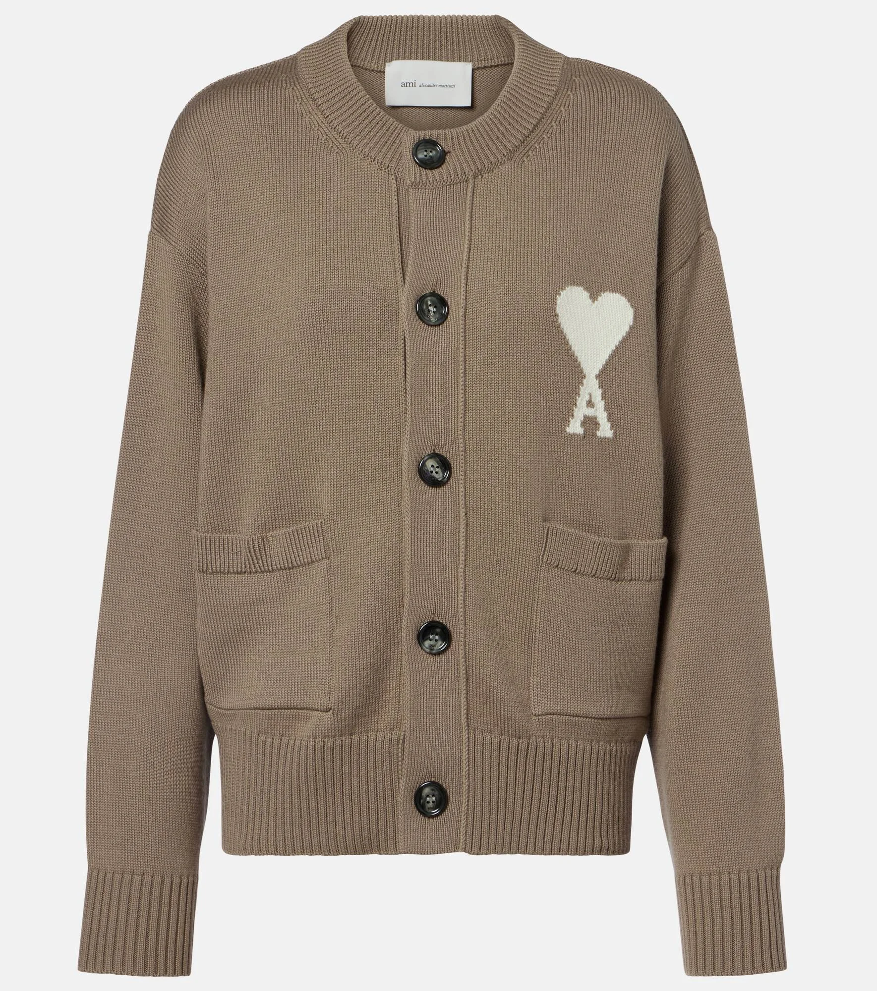 A symbol of Ami Paris since 2016, the Ami de Cœur logo is named after the French expression for "friend of the heart". Embroidered on this wool and cotton cardigan, the design is finished with a buttoned front and ribbed trims. Product Details - Material: 53% wool, 47% cotton - Care instructions: hand wash cold - Made in Portugal - Color: beige - Designer color name: Beige Taupe/Ecru - Contains non-textile parts of animal origin - Cuff: ribbed - Pockets: patch pockets - Closure: buttoned front - Hem: ribbed - Item number: P01144916 Size & Fit - Fits large to size - we recommend trying one size smaller - Dropped shoulders - Designed for a loose fit - Stretchy fabric - Falls below the hip - The model seen in the picture is 178cm-5'10" and wearing a size XXS