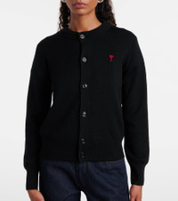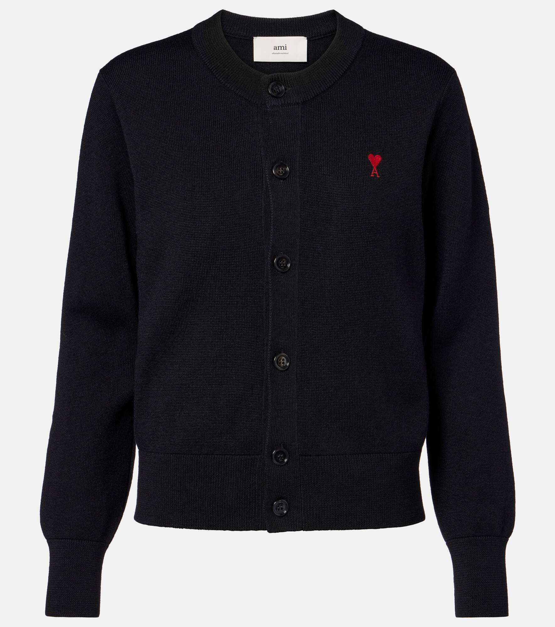 A symbol of Ami Paris since 2016, the Ami de Cœur logo is named after the French expression for "friend of the heart". Crafted from wool, this cardigan features a classic buttoned front and ribbed-knit trims. Product Details - Material: 100% wool (merino wool) - Care instructions: dry clean - Made in Italy - Designer color name: Noir/Rouge - Item color: black, red - Cuff: ribbed - Closure: buttoned front - Hem: ribbed - Item number: P01073923 Size & Fit - True to size - Straight fit - Stretchy fabric - Falls to the hip - The model seen in the picture is 178cm-5'10" and wearing a size XS