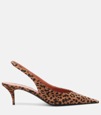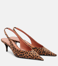 Amina Muaddi has quickly become a fashionable favorite thanks to its eye-catching and sculptural shoes. Made in Italy from leopard-printed suede, the Anok pumps are a slingback pair with pointed-toe silhouettes and 55mm kitten heels. Product Details - Upper: calf leather (suede) - Lining: leather - Sole: leather insole, leather and rubber sole - Toe shape: pointed toe - Made in Italy - Includes: shoe box, dust bag - Designer color name: Leopard - Item color: brown - Closure: elasticated strap - Item number: P01098736 Size & Fit - Fits slightly large to size - we recommend trying a half size smaller - European sizes - 5,5cm-2" heel (size EU 38)