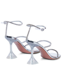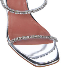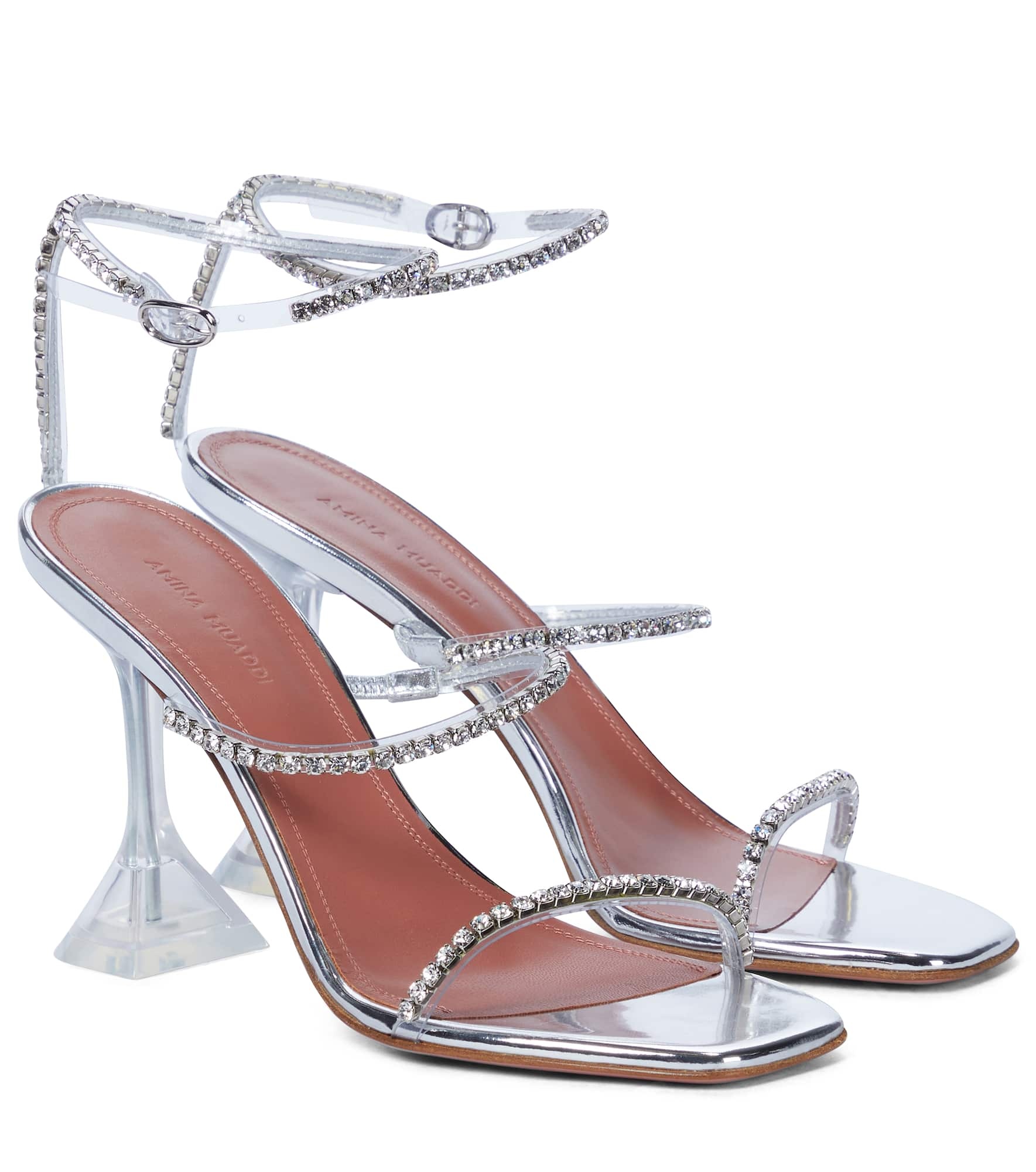 The Gilda sandals from Amina Muaddi are a very modern interpretation of fairytale glass slippers. Dubbed as such by the label, this pair is made from silver-toned leather and has crystal-embellished PVC straps, square toes, and the brand's signature "Martini" heels. Product Details - Sole: leather insole and sole - Lining: polyvinyl chloride - Upper: polyvinyl chloride - Toe shape: square open toe - Trim: lamb leather - Closure: buckle-fastening ankle strap - Made in Italy - Item number: P00561108 Size & Fit - Fits slightly small to size - we recommend trying a half size larger - European sizes - 11cm-4.5" heel (size EU 38)