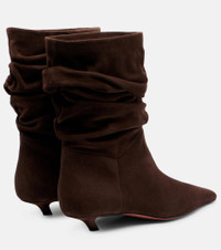 Amina Muaddi has quickly become a fashionable favorite thanks to its eye-catching and sculptural shoes. Made from soft suede, the Jamie ankle boots are defined by a draped silhouette with 25mm kitten heels. Product Details - Upper: calf leather (suede) - Lining: leather - Sole: leather insole, leather and rubber sole - Color: brown - Toe shape: pointed toe - Made in Italy - Includes: dust bag, shoe box - Designer color name: Coffee - Item color: brown - Item number: P01098785 Size & Fit - Fits slightly large to size - we recommend trying a half size smaller - European sizes - 2,5cm-1" heel