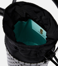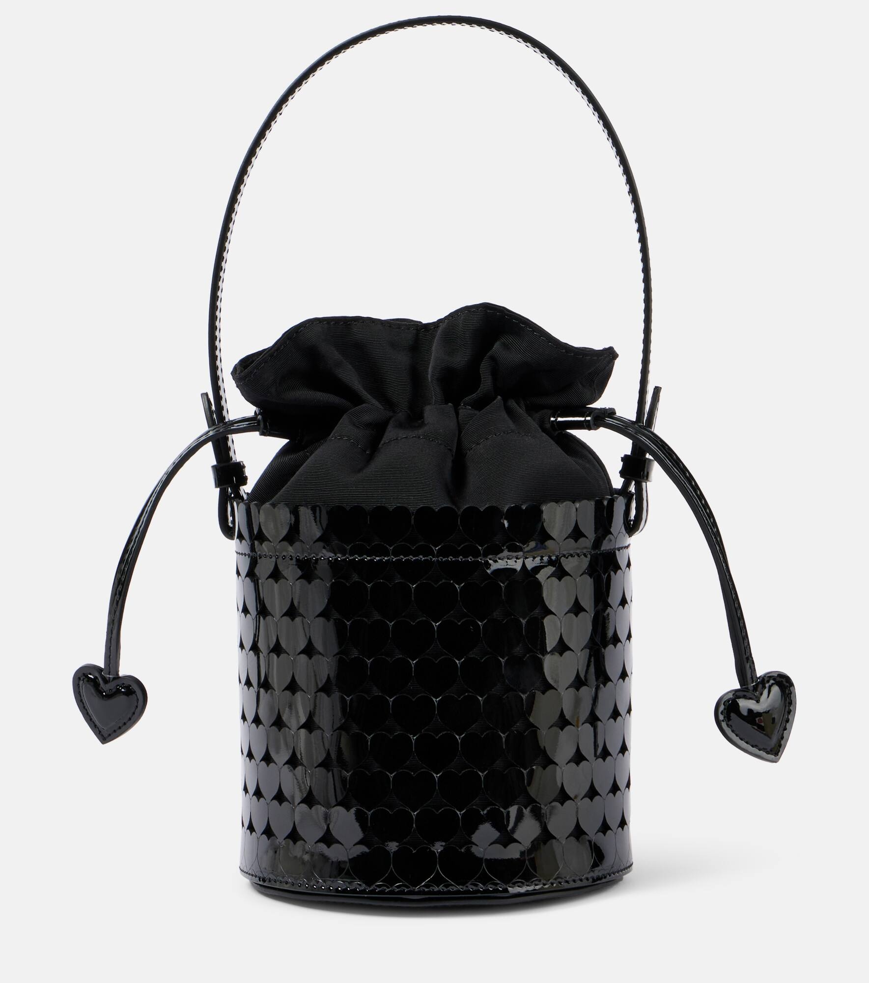 Crafted in Italy, the Amorouse bucket bag from Aquazzura features a heart-shaped pattern all over. It has a drawstring at the top for closure. Product Details - Material: fabric - Lining: fabric - Made in Italy - Designer color name: Black/Light Gold - Item color: black - Trim: leather - Closure: drawstring top - Top handle - Item number: P01020754 Size & Fit - Height 13/19cm-5/7.5" - Width 13cm-5" - Depth 13cm-5" - Length of handle 39cm-15.5"