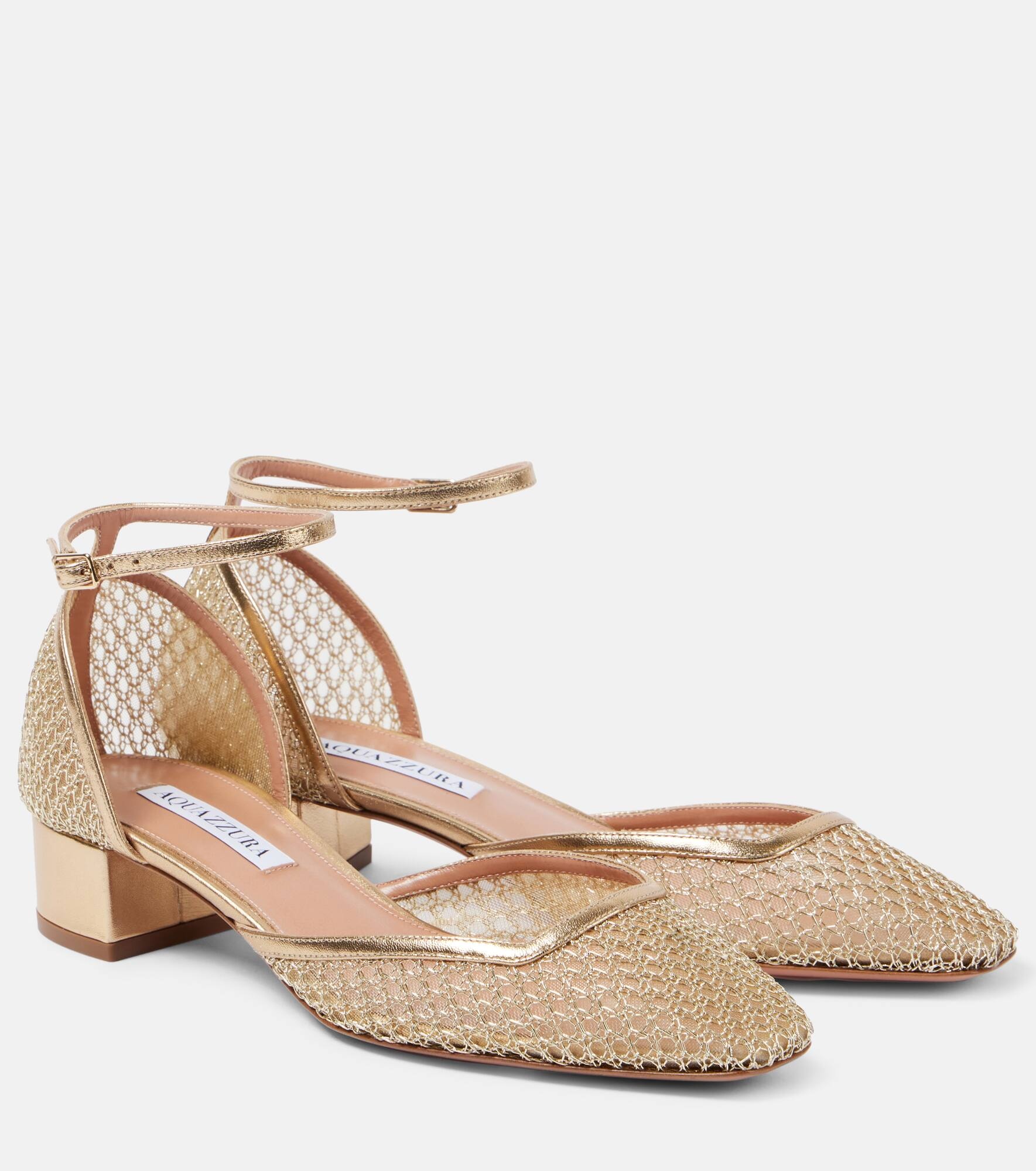 Asha 35 leather-trimmed metallic mesh pumps Gold