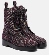 The Ben combat boots from Aquazzura are designed with tweed uppers, showcasing an intricate pattern. This pair sits atop 20mm heels and features leather trims and laces finished with golden detailing. Product Details - Upper: fabric, leather - Lining: leather - Sole: leather insole, leather and rubber sole - Toe shape: round toe - Made in Italy - Includes: shoe box, dust bag - Designer color name: Blackberry - Item color: purple, black - Trim: leather - Hardware color: gold - Closure: lace-up, zipped side - Item number: P01097521 Size & Fit - True to size - For narrow feet, we recommend trying a half size smaller - European sizes - 3cm-1" platform (size EU 38) - 4cm-1.5" wedge heel (size EU 38)